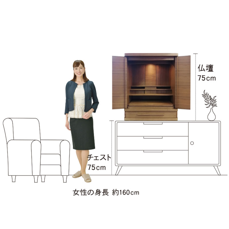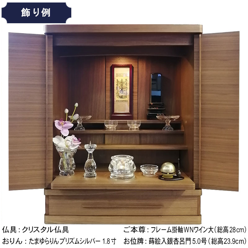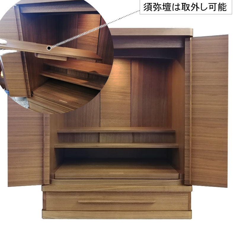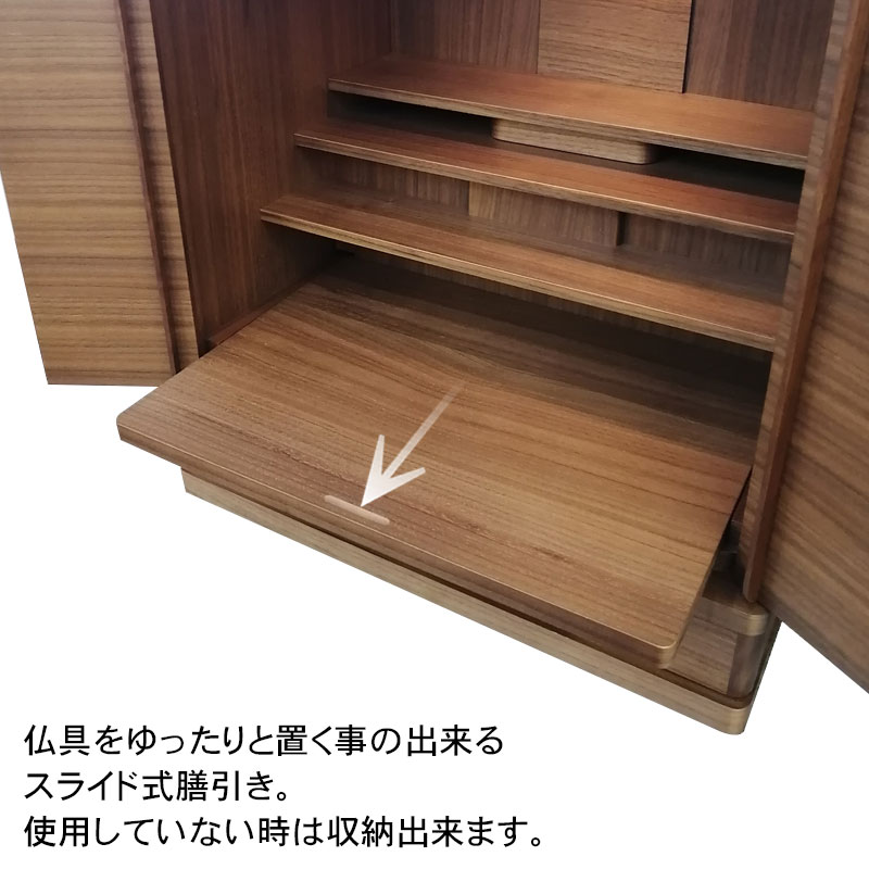 | 商品説明 | 【商品番号:3328】 ■材質詳細 ・笠、台輪/主材料:ウォールナット薄板貼り 芯材料:パーティクルボード、木質繊維板 ・戸板、扉/主材料:ウォールナット薄板貼り 芯材料:パーティクルボード、木質繊維板 ・その他/表面仕上げ:ウレタン仕上、生産地:日本 ■宗派 どの宗派でもお使いいただけます。 ■備考 ・商品は手作りの為、一部の色、デザイン、寸法が多少変更になる場合がございます。 ウォールナットの繊細な木目が美しいすっきりしたデザインのお仏壇です。 シンプルなデザインなので、洋室和室問わず設置することができます。 須弥壇は取外し可能で、ご本尊やお位牌の大きさに合わせて調整できます。 スライド式の膳引きに、お仏壇周りの小物を収納する引出も付いています。 |