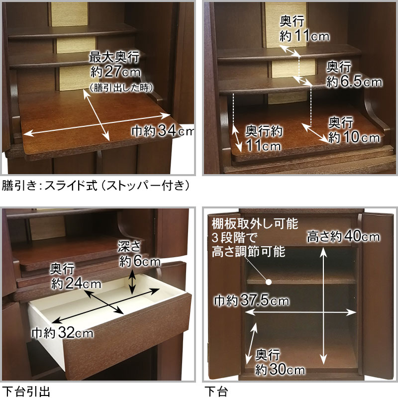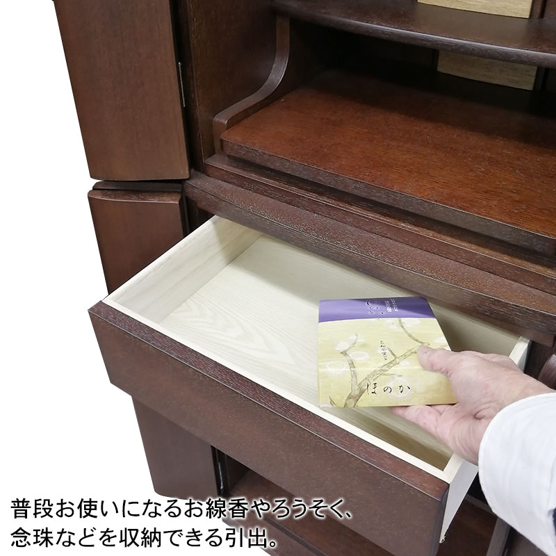 | 商品説明 | 【商品コード:3329】 ◎日本堂オリジナル商品 ■材質詳細 ●笠、台輪/主材料:タモ薄板貼り 芯材料:MDF ●戸板、扉/主材料:タモ薄板貼り 芯材料:MDF ●その他/表面仕上げ:ウレタン/オープン仕上げ、生産地:海外 ■宗派 どの宗派でもお使いいただけます。 ■備考 ・商品は手作りの為、一部の色、デザイン、寸法が多少変更になる場合がございます。 総高さ120cmと現代の住宅事情に合わせて、台付タイプのお仏壇としてはコンパクトな40号サイズのお仏壇です。タモ材を表面材に使用し落ち着いた色合いとなっております。 膳引きは、スライド式となっており、お祀りいただいた仏具をそのまま中に収納して扉を閉めることができます。 下台部分には引出収納を完備し、お仏壇用品など十分な収納機能となっております。また、下台の棚板は3段階で高さ調節可能で、棚板を外すと骨壷が収納できるスペースがあるので、納骨まで骨壺をご安置、または自宅墓としてもお使いいただけます。 内部照明には、LEDライトを使用しております。 |