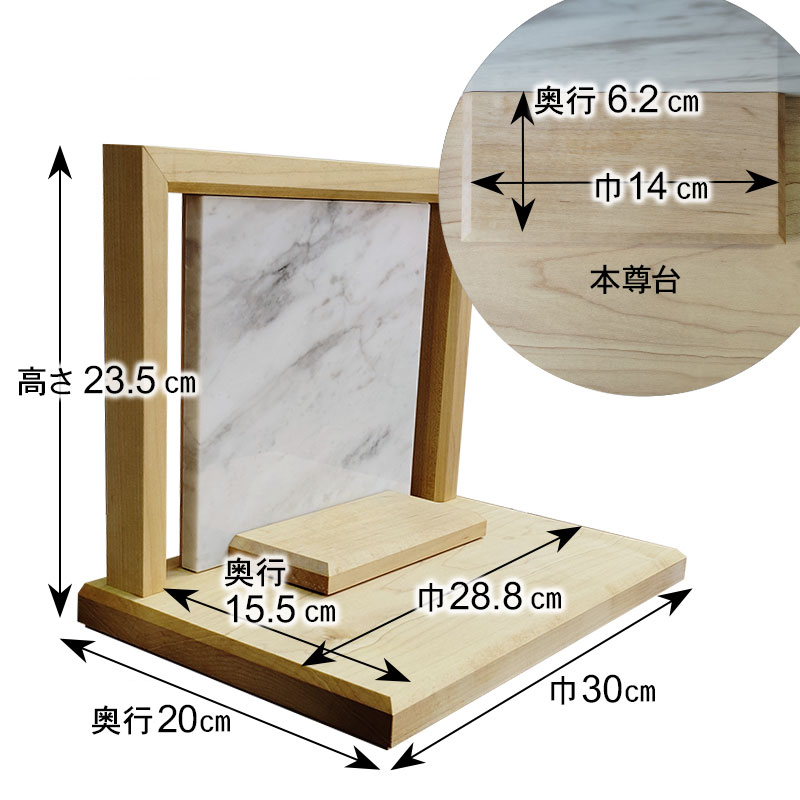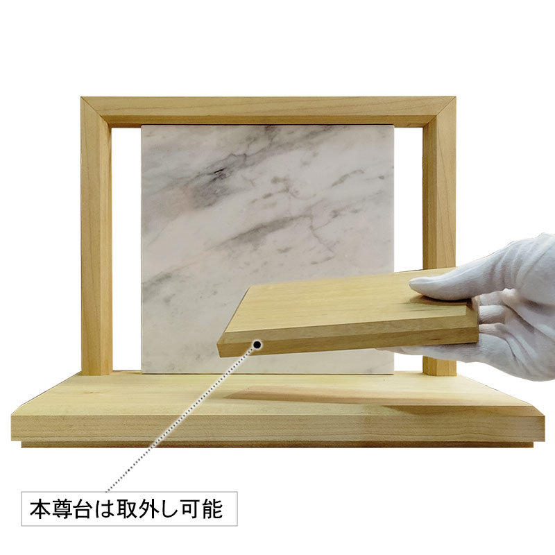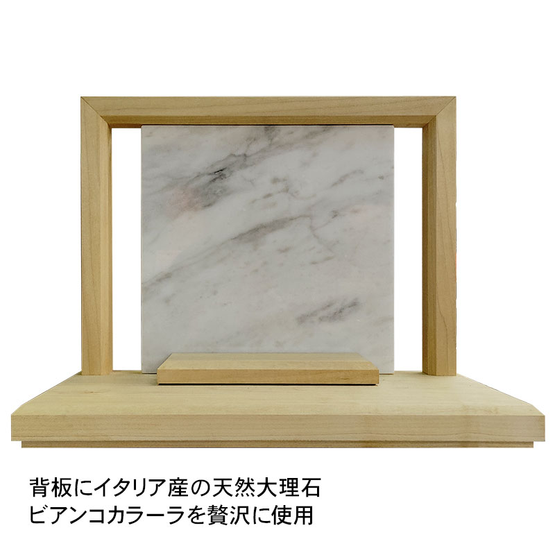 | 商品説明 | 【商品番号:3401】 ■商品詳細 ●材質:メープル、イタリア産天然大理石(ビアンコカラーラ) ●サイズ:高さ23.5cm×幅30cm×奥行20cm ●日本製 イタリア産の天然大理石ビアンコカラーラを背板部分に贅沢に使用したオープン型の供養ステージです。 場所を取らない小さなインテリア仏壇で、小さいながらもしっかりとした作りのシンプルで飽きのこないデザインとなっております。 写真やミニ骨壷などの手元供養品を自由にお祀りいただけます。 |