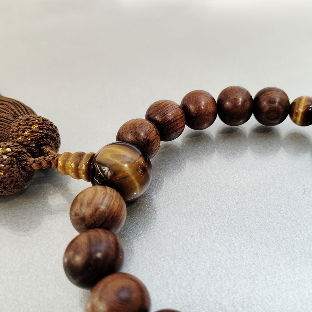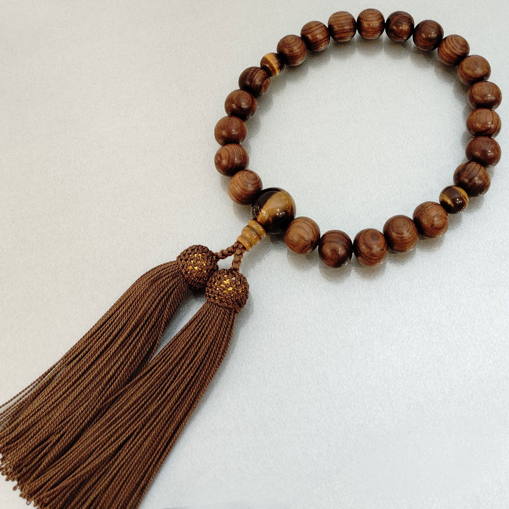 | 商品説明 | 【商品コード:3418】 ■珠の素材 ●主珠:栴檀(約13mm) ●親珠:虎眼(約16mm) ●天珠:虎眼(約10mm) ■房の素材 ●正絹房(房、通し糸共正絹) ■特徴 主珠に栴檀、親珠、天珠に虎目石を使用した男性用の数珠です。 栴檀は、淡黄褐色に茶褐色の美しい木目が特徴で、葉や木材には弱い芳香があります。 天然木ならではの使い込むごとに風合いが増し経年変色を楽しんでいただくことができます。 アクセントには、男性に人気の虎眼石を使用しております。 虎眼石は、青い石綿の繊維が層状に混入している石英で、黄褐色の光沢があり、光の反射によって縞模様が虎の眼のように見えることから、その名が付けられたとされています。 天然木の素材のよさを生かした栴檀に、虎目石を仕立てたお数珠となっております。 房には高級素材の正絹を使用しており京都の数珠職人が匠の技で仕立てた逸品でございます。 また、房の先端は、糸の先が小さなループ状に撚ってある撚房となっており、ほつれにくいつくりになっています。 数珠は、寿珠とも言われ縁起のいいプレゼントとして、成人式や就職祝いなどに贈られることが多いようです。 進物用の商品につきましては、包装をしてお届けいたします。 「志」「御祝」などの、のし紙も無料でお付けすることができます。 包装やのし紙をご希望の方は、お客様情報入力ページの「ご連絡事項」欄にご記入ください。 ■宗派 どの宗派でもお使いいただける片手略式数珠です。 ■備考 ●数珠は紙箱入り ●天然素材のため商品には若干の差があります。 |