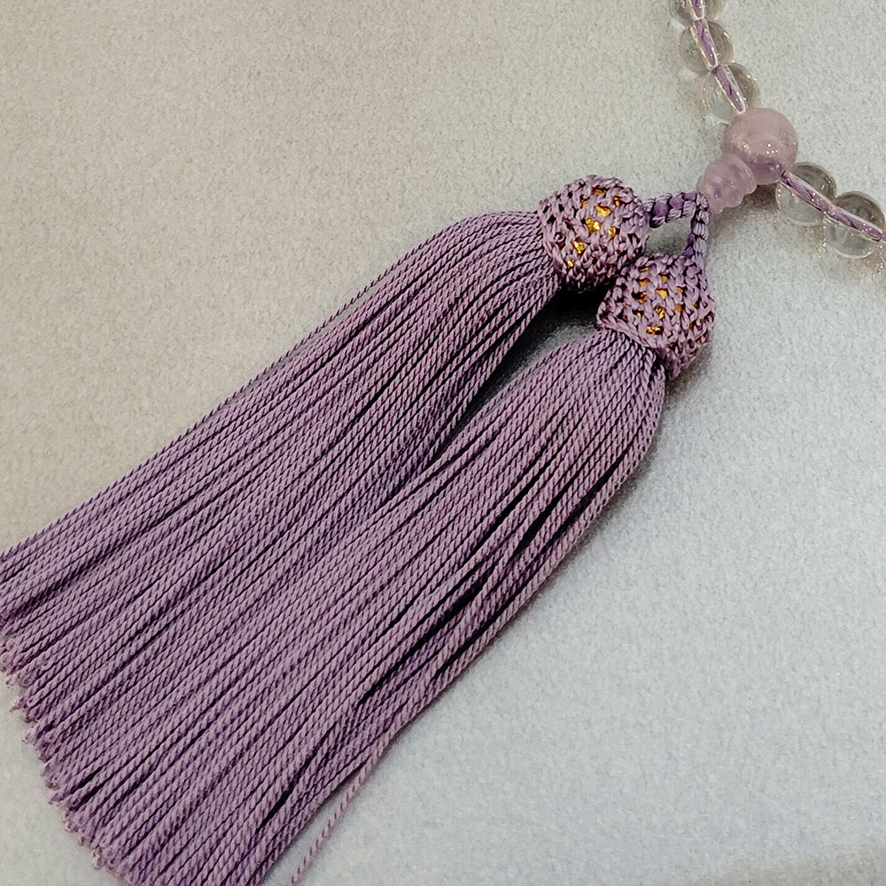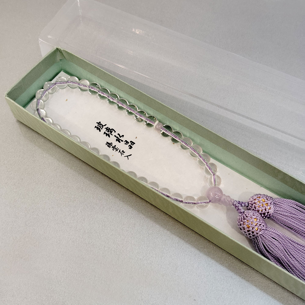 | 商品説明 | 【商品コード:3420】 ■珠の素材 ●主珠:玻璃水晶(約7mm)※玻璃(ハリ)はガラスのことです。 ●親珠:藤雲石(約10mm) ●天珠:藤雲石(約5mm) ■特徴 主珠に玻璃珠(水晶風の丸ガラス)を使用、親珠、天珠には藤雲石を使用しています。 主珠に玻璃珠を使用する事で、お求めやすい価格となっております。 藤雲石は、紫色の薄いアメジスト(紫水晶)の中で白色の雲のような模様があり、柔らかな藤色が魅力のひとつです。 藤雲石のやさしく落ち着いた色合いは、年齢を問わずご使用いただける仕上がりとなっております。 房の先端は、糸の先が小さなループ状に撚ってある撚房となっており、ほつれにくいつくりになっています。 数珠は、寿珠とも言われ縁起のいいプレゼントとして、成人式や就職祝いなどに贈られることが多いようです。 進物用の商品につきましては、包装をしてお届けいたします。 「志」「御祝」などの、のし紙も無料でお付けすることができます。 包装やのし紙をご希望の方は、お客様情報入力ページの「ご連絡事項」欄にご記入ください。 ■宗派 どの宗派でもお使いいただける片手略式数珠です。 ■備考 ●数珠は紙箱入り |
