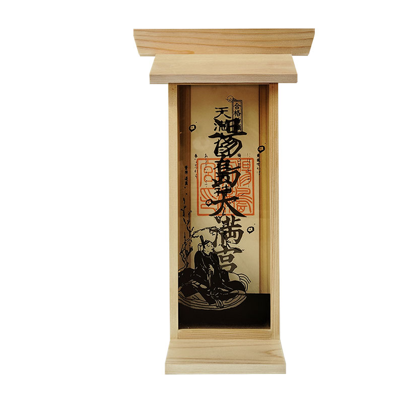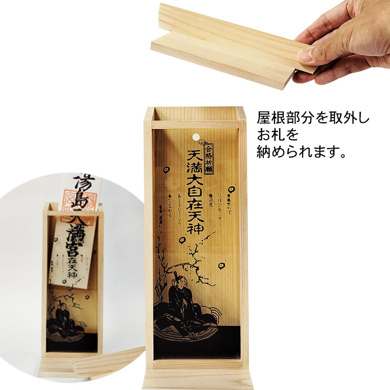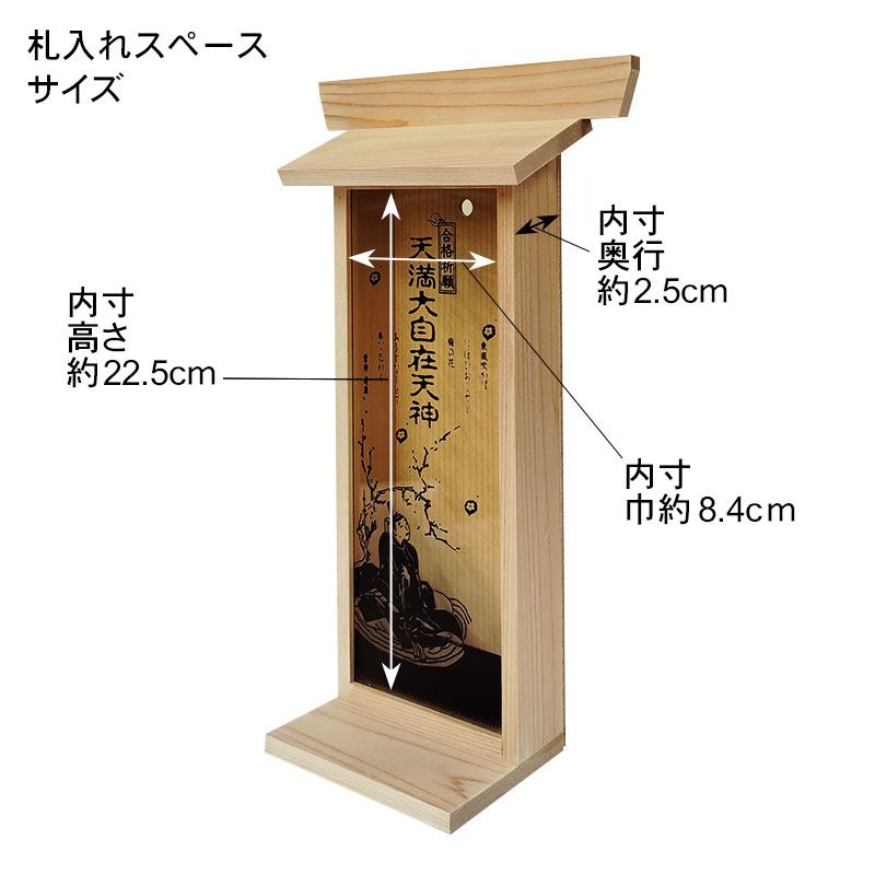 | 商品説明 | 【商品コード:3431】 ■商品詳細 ●商品サイズ:高さ 約29.4×幅 約10×奥行 約8.3cm ●札入れスペース:高さ 約22.5×幅 約8.4×奥行 約2.5cm ●原産国:日本 ●材質:国産檜材 ※写真にあるお札は付属しません。 優しい天然木の国産檜材を使用した札立用コンパクト神棚「合格社」です。 透明なアクリル板に学業の神様天満大自在天神が描かれていて、屋根部分を取り外して、お札などを入れて神棚のようにお祀りできます。 合格祈願、試験合格祈願、入試合格祈願、学業上達祈願、就職成就祈願など様々な目的でご利用いただけます。 コンパクト設計なので、棚やテーブルの上に置いたり、 背面にある穴を使って壁掛け用としてもご利用いただけます。 また、贈り物としてもお気軽にお使いいただける商品です。 【天満大自在天神とは】 天満大自在天神(てんまんだいじざいてんじん)とは、菅原道真を神格化した呼称、または神格化した道真を祀る神社を指します。道真は学問の神として広く信仰されています。? |