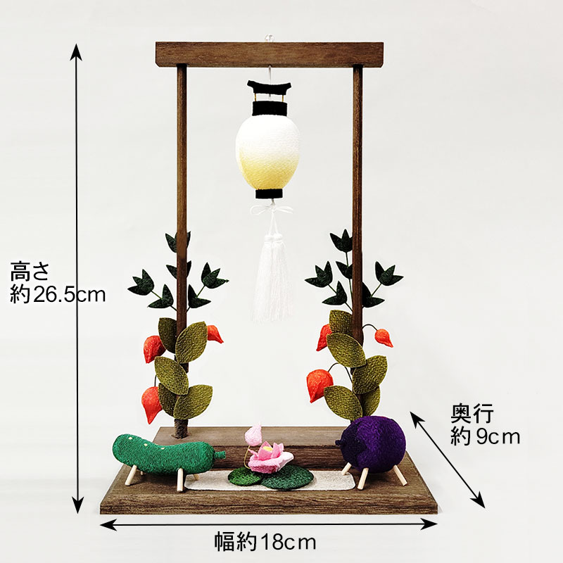 | 商品説明 | 【商品コード:3445】 ■商品詳細 ●サイズ:高さ約26.5×幅約18×奥行9cm ●素材:レーヨンちりめん他 ●日本製 ■備考: ※手作りのため生地の取り方により柄の出かたが多少変わる場合がございます。 京職人が一つひとつ丁寧に仕上げたちりめん細工のお盆飾りです。 ちりめん細工は、江戸時代からの伝統技法で「しぼ」という細かい凹凸のあるやわらかな布を使ってなすやきゅうりをかたどっています。 高さ26.5×幅18cmとコンパクトで置く場所に困りません。 形式にとらわれず、自由にお飾りいただけます。 |