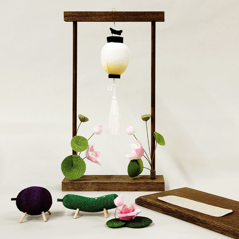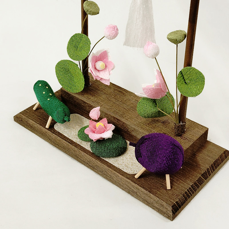 | 商品説明 | 【商品コード:3446】 ■商品詳細 ●サイズ:高さ約26.5×幅約18×奥行9cm ●素材:レーヨンちりめん他 ●日本製 ■備考: ※手作りのため生地の取り方により柄の出かたが多少変わる場合がございます。 京職人が一つひとつ丁寧に仕上げたちりめん細工のお盆飾りです。 ちりめん細工は、江戸時代からの伝統技法で「しぼ」という細かい凹凸のあるやわらかな布を使ってなすやきゅうりをかたどっています。 高さ26.5×幅18cmとコンパクトで置く場所に困りません。 形式にとらわれず、自由にお飾りいただけます。 |