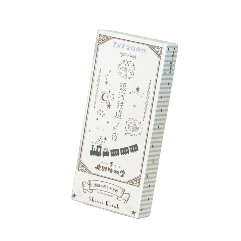 | 商品説明 | 【商品コード:3456】 【商品詳細】 ●内容量:約50g ●本数:120本 ●燃焼時間 約30分 けむり:ふつう ●パッケージサイズ 高さ16cm×長さ7.2cm×奥行2.4cm ※燃焼時間は、場所・気候(室内状態)により変化致します。 宮沢賢治の代表作「銀河鉄道の夜」の世界観を柔らかなホワイトと夜空に浮かぶ星座のイラスト印象的なパッケージのお線香。 作中にも薔薇の香りという表現が登場し、お線香から香る薔薇の香りはまるで「銀河鉄道の夜」の世界に入り込んだよう 薔薇の香りに満たされ、宮沢賢治の作品世界に満たされたひと時をお楽しみください。 |