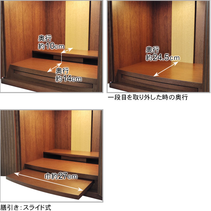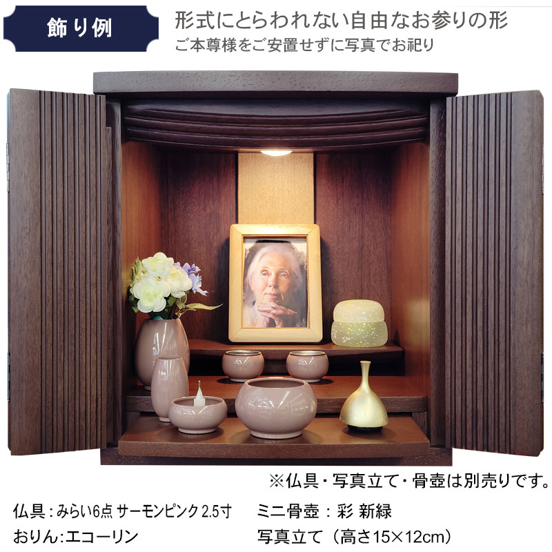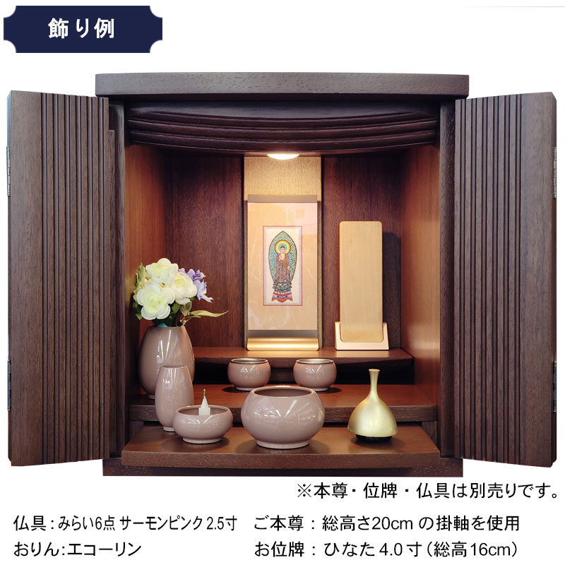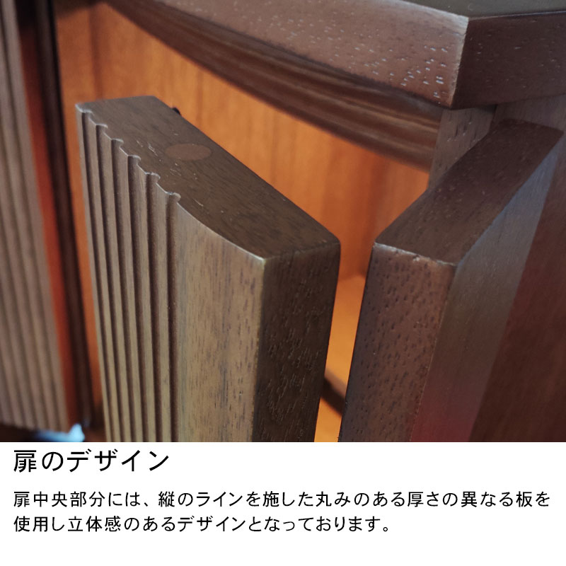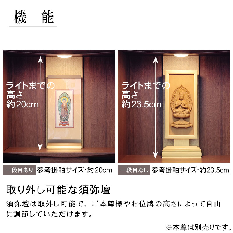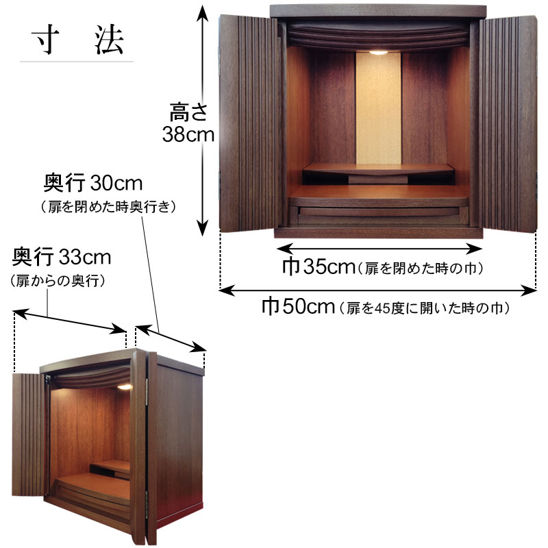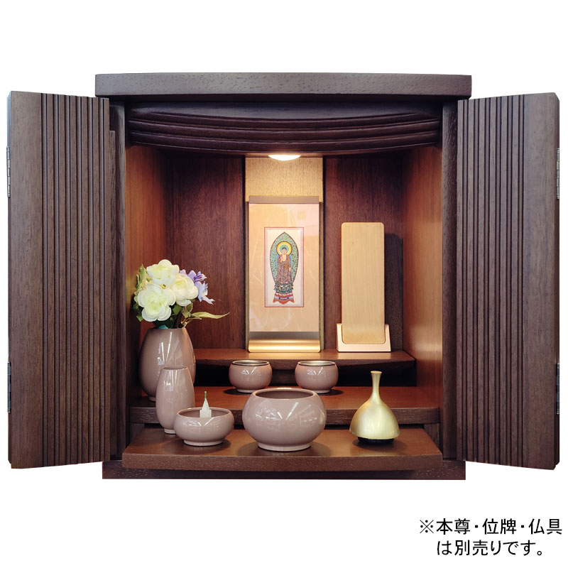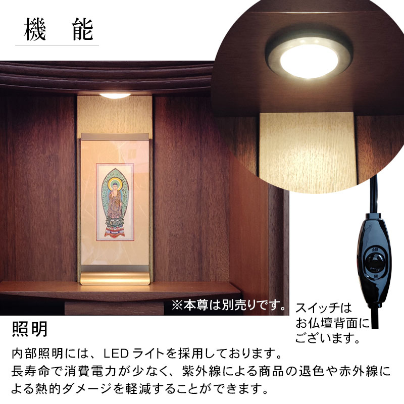 | 商品説明 | 【商品コード:00】 ■材質詳細 ・笠、台輪/主材料:ウォールナット 芯材料:MDF ・戸板、扉/主材料:ウォールナット 芯材料:MDF ・その他/表面仕上げ:ウレタン、生産地:海外 ■宗派 どの宗派でもお使いいただけます。 ■備考 ・商品は手作りの為、一部の色、デザイン、寸法が多少変更になる場合がございます。 こちらのお仏壇は12号と小型サイズですので、小さなお部屋や家具の上などにも置いてご利用いただけます。 ウォールナット材を使用しており、コンパクトながらも重厚感のあるお仏壇となっております。ウォールナットは、世界三大銘木としても知られ、深みのある濃いブラウンと美しい木目が特徴です。高級感ある深い色合いは、家具はもちろん建材や楽器など幅広い分野で人気の材料となっております。 扉中央部分には、縦のラインを施した丸みのある厚さの異なる板を使用し立体感のあるデザインとなっております。 須弥壇は取外し可能で、ご本尊様やお位牌の高さによって自由に調節していただけます。 仏具をゆったりと置くことのできるスライド式膳引き。使用していない時は収納できます。 内部照明には、LEDライトを採用しております。長寿命で消費電力が少なく、紫外線による商品の退色や赤外線による熱的ダメージを軽減することができます。 |