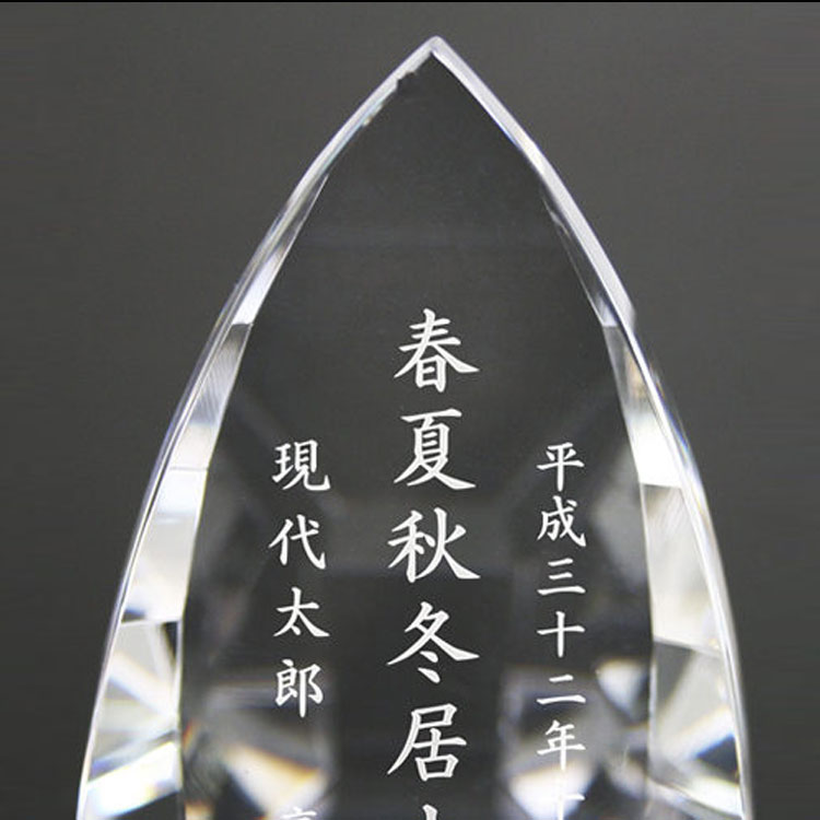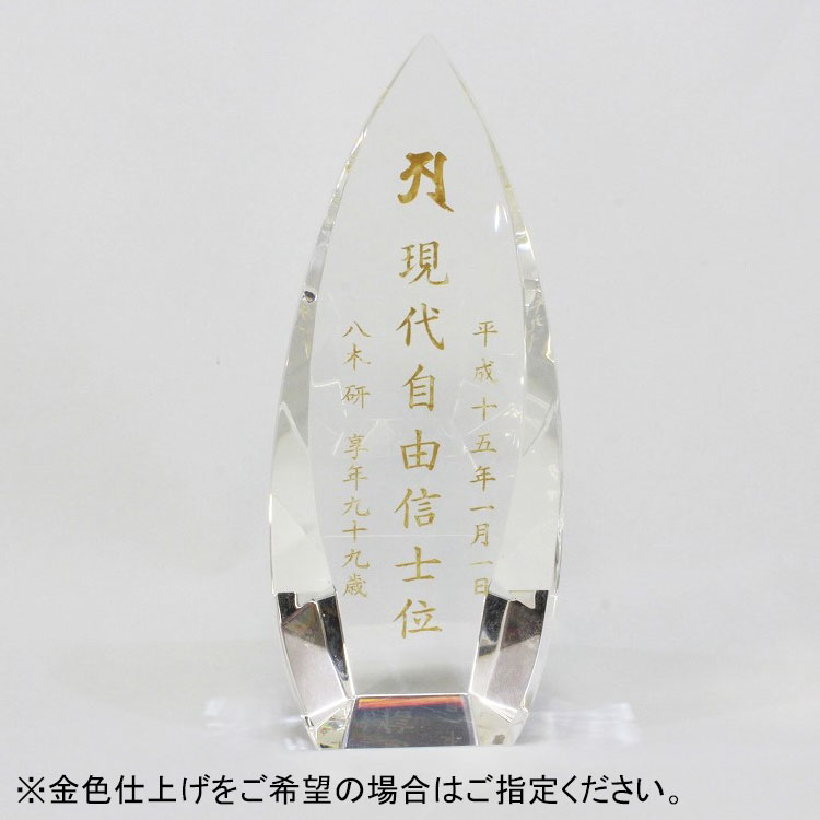| 商品説明 | 【商品番号:2171】 光の反射と屈折の美しさを最大限に引き出すためにデザインされたガラス位牌です。 クリスタル位牌の文字彫り輝くクリスタル位牌にメッセージを彫る方が増えています(文字入れは別料金)。 感謝の気持ちや大切な言葉、想いをカタチにしませんか。 レーザー光線で彫刻するのでシャープな仕上がり。 ■商品詳細 ●商品タイプ:クリスタル位牌 ●材質:光学ガラス ●生産国:海外製 ●サイズ:高さ17.0cm×幅7.0cm×奥行4.7cm ※文字彫りはおもて面のみとなります。 ※文字はパールホワイト色で仕上げます。 金色仕上げをご希望の場合はご指定ください。 ※寸法は商品と多少異なる場合がございます。 ※上記価格はお位牌本体の料金です。名入れの料金は含まれておりません。 名入れは別途「彫り代」が必要です。 ※メーカー発注品となります。 ご注文・お問合せを頂いてからメーカーに在庫の確認を致します。(ご注文の流れをご参照ください) ※ご入金確認後にメーカー発注となりますので、お支払い方法で「商品代引き」以外を選択してください。 ※名入は、お客様に名入れの原稿確認をして頂き、文字確認原稿確定後「メーカー営業日の約2週間後の発送」となりますので、余裕をもってご注文ください。 |