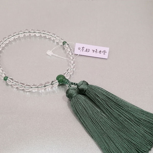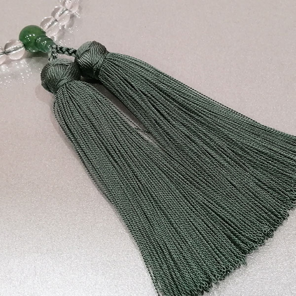 | 商品説明 | 【商品コード:2197】 ■珠の素材 ●主珠:水晶(約7mm) ●親珠:翡翠(約10mm) ●天珠:翡翠(約5mm) ■房の素材 ●正絹古都房(房、通し糸共正絹) ■特徴 主珠に水晶、親珠、天珠に翡翠をアクセントとして使った女性用の数珠です。 水晶はクリスタルとも呼ばれ、無色透明な石で、日本の国石(象徴石)にも選ばれています。 翡翠は、深緑の半透明な宝石の一つで、東洋(中国)、中南米(アステカ文明)では古くから人気が高い宝石で、金以上に珍重されていました。その豊富な色の原石が、美しい「翡翠」(カワセミ)をイメージさせることから「翡翠玉」と呼ばれるようになり、その名前が中国から日本へと伝わってきたとされています。 翡翠の歴史では日本が最も古く、縄文時代から勾玉として使用されてきました。中国でも「玉(ぎょく)」と呼ばれ、古来より王の象徴として特別に扱われてきました。 水晶の透明な輝きに、翡翠の落ち着いた優しい色合いが高級感と上品さを感じさせる美しい仕上がりになっております。 古都房には高級素材の正絹を使用しており京都の数珠職人が匠の技で仕立てた逸品でございます。 数珠は、寿珠とも言われ縁起のいいプレゼントとして、成人式や就職祝いなどに贈られることが多いようです。 進物用の商品につきましては、包装をしてお届けいたします。 「志」「御祝」などの、のし紙も無料でお付けすることができます。 包装やのし紙をご希望の方は、お客様情報入力ページの「ご連絡事項」欄にご記入ください。 ■宗派 どの宗派でもお使いいただける片手略式数珠です。 ■備考 ●数珠は桐箱入り(桐箱は防腐成分や虫よけの成分を含み、湿気予防にも最適です。保管の際は、防虫剤を一緒に入れると虫食い予防になります。) ●天然素材のため商品には若干の差があります。 |