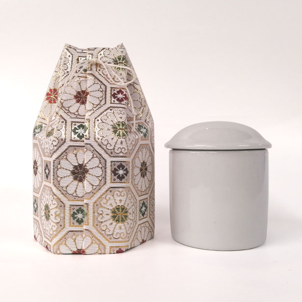 | 商品説明 | 【商品コード:2240】 ■商品詳細 「分骨つぼ」 ●材質:陶器製 ●外寸サイズ:直径7.6cm、高さ8.8cm 「収納袋」 ●材質:布、厚紙 ●外寸サイズ:直径9cm、高さ15cm 手元供養・分骨などに最適なコンパクトサイズの陶器製骨壺と袋のセットです。 骨壷を入れる袋は、六角で素材自体に厚みがあり、しっかりとした作りになっています。 後ろの紐を解いて上から骨壷を入れてください。再び紐を結ぶだけでOKです。 正面には飾り結びが端正な印象を与える、白房が付いております。 本山や菩提寺に分骨を納めるとき、手元供養などご自宅に置いておくときに分骨つぼを使います。 小動物などのペット用としてもご利用いただけます。 |
