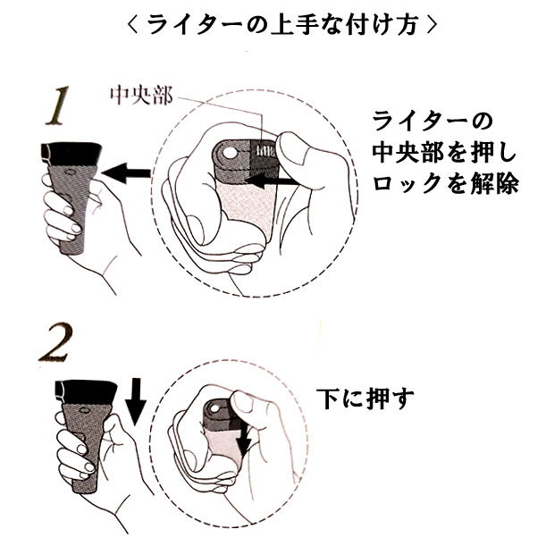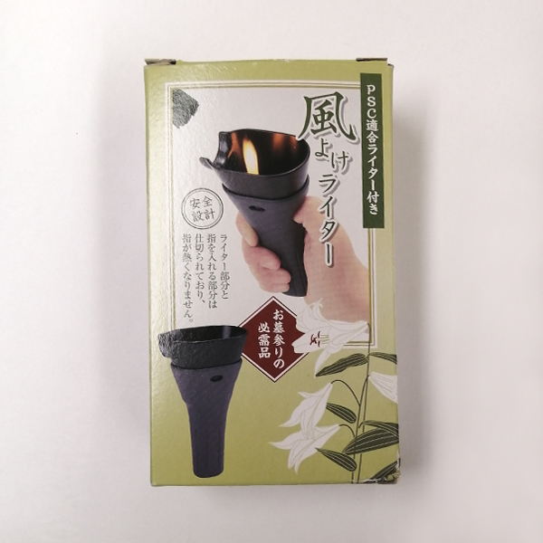 | 商品説明 | 【商品コード:2250】 ■商品詳細 ●商品サイズ:約7.5×4.6×13.5cm ●本体重量:約64g ●付属ライター(チャイルドレジスタンス機能つきライター) お墓参りの時、お線香に火をつけようとすると、風がすぐに吹き消してしまい随分と手間取ることがあります。 そんな時、使っていただきたいのがこの風よけライター。 フードが効果的に風を防ぎ、簡単に安全に、しかも素早くお線香に火がつけられます。 また、ライター部分と指を入れる部分は仕切られており指が熱くなりません。 お彼岸やお盆のお墓参りになどのお供に、ぜひご活用ください。 |