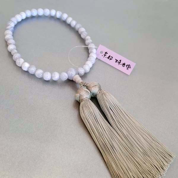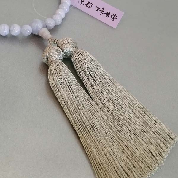 | 商品説明 | 【商品コード:2256】 ■珠の素材 ●主珠:カルセドニー(約7mm) ●親珠:カルセドニー(約10mm) ●天珠:カルセドニー(約5mm) ■房の素材 ●正絹古都房(房、通し糸共正絹) ■特徴 主珠、親珠、天珠にカルセドニーを使った女性用の数珠です。 淡い水色の天然石の表面には穏やかな波模様が現れており、女性らしい柔らかな色合いが品の良さを感じさせてくれます。 カルセドニーは水晶と同じ石英グループの一種で、和名では玉髄(ぎょくずい)といいます。 独特の優しさや色合いが昔から親しまれてきた女性に人気の数珠となっております。 頭付松房には高級素材の正絹を使用しており京都の数珠職人が匠の技で仕立てた逸品でございます。 数珠は、寿珠とも言われ縁起のいいプレゼントとして、成人式や就職祝いなどに贈られることが多いようです。 進物用の商品につきましては、包装をしてお届けいたします。 「志」「御祝」などの、のし紙も無料でお付けすることができます。 包装やのし紙をご希望の方は、お客様情報入力ページの「ご連絡事項」欄にご記入ください。 ■宗派 どの宗派でもお使いいただける片手略式数珠です。 ■備考 ●数珠は桐箱入り(桐箱は防腐成分や虫よけの成分を含み、湿気予防にも最適です。保管の際は、防虫剤を一緒に入れると虫食い予防になります。) ●天然素材のため商品には若干の差があります。 |