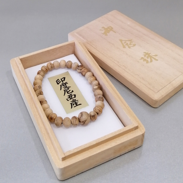 | 商品説明 | 【商品コード:2275】 ■珠の素材 ●主珠:沈香(約8mm) ●親珠:沈香(約11mm) ●天珠:沈香(約7mm) ■腕回りサイズ:約17.5センチ(内周) ■特徴 天然香木の沈香で仕立てた腕珠です。 沈香は、東南アジアに生息する植物である沈香木などが、木質部に様々な外的要因、傷がついたり、虫に食われたりすることで、樹脂が分泌され、その樹脂が蓄積されて長い歳月で厚くなり、凝固した部分です。 沈香ができるメカニズムには現在でも謎が多く、沈香の木すべてから沈香が取れるわけではなく、様々な要因がないと沈香にはならない為、非常に稀少価値が高い天然香木です。 その昔、武士の間では、香木は、権力の象徴ともいわれ、奈良の正倉院に所蔵されている「蘭奢待」は、時の権力者たちが競ったように切り取った後が残されています。 日本では、5世紀には、輸入されていたことがわかっていますが、近年では、ワシントン条約に記載されている貴重な品となっています。 進物用の商品につきましては、包装をしてお届けいたします。 「志」「御祝」などの、のし紙も無料でお付けすることができます。 包装やのし紙をご希望の方は、お客様情報入力ページの「ご連絡事項」欄にご記入ください。 ■備考 ●腕輪は桐箱入り(桐箱は防腐成分や虫よけの成分を含み、湿気予防にも最適です。保管の際は、防虫剤を一緒に入れると虫食い予防になります。) ●天然素材のため商品には若干の差があります。 |