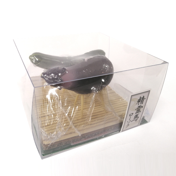 | 商品説明 | 【商品コード:2322】 ■商品詳細 ●重量 : 80 (g) ●サイズ: ナス:φ3.2cm×長さ7cm キュウリ:φ2cm×長さ9.7cm パッケージサイズ:幅11.8cm×長さ11.8cm×高さ6.9cm ●材質:パラフィン(一般的なロウソク原料)・ピック ※こちらの商品は食べられません。 ※火をつける際は、ピックを抜き別途耐熱性のお皿などに移して着火してください。 精霊馬ローソク 故人の好物シリーズ 多くの地方でお盆飾りとして使われる「精霊馬」を、仏壇に飾りやすくミニサイズにして再現しました。 精霊馬は、ご先祖様の送り迎えの乗り物になります。馬はご先祖様が早く帰ってこられるように、牛はゆっくり戻れるようにと言われています。お盆前には、牛と馬を内側に向け、十六日には外に向けて置きます。 本物と違い賞味期限がないので、ずっと飾っておくことができます。 好物キャンドルは、職人が心込めてひとつひとつ丁寧に手作りしています。 『故人が好きだったものを、想いを込めて捧げたい』 そんな思いから誕生した好物キャンドルが、 2015年度グッドデザイン賞を受賞。 人気の「ミニジョッキ」をはじめとした定番アイテムなど様々なラインナップを揃えております。 |