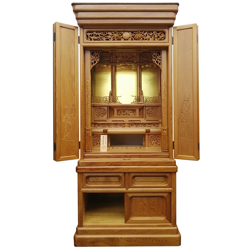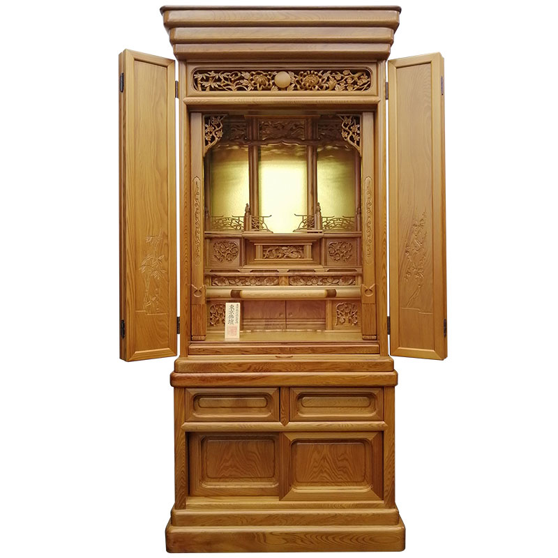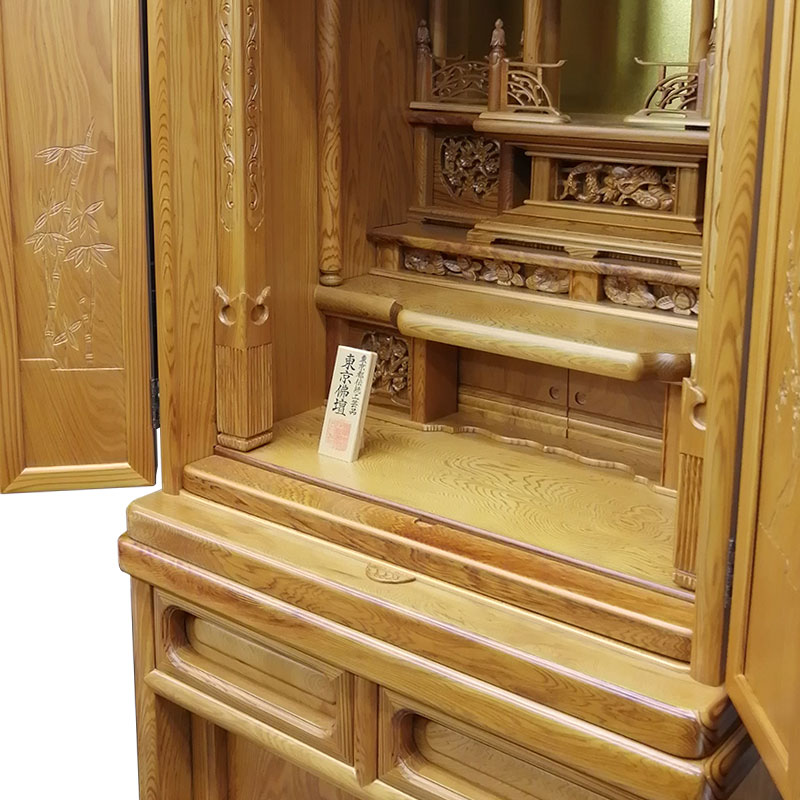 | 商品説明 | 【商品コード:2469】 ■材質詳細 ・笠、台輪/主材料:屋久杉無垢 芯材料:屋久杉 ・戸板、扉/主材料:屋久杉無垢 芯材料:屋久杉 ・大戸軸/主材料:屋久杉厚板貼り 芯材料:朴 ・その他/表面仕上げ:摺漆仕上げ、生産地:日本 ■宗派 どの宗派でもお使いいただけます。 ■備考 ・商品は手作りの為、一部の色、デザイン、寸法が多少変更になる場合がございます。 お仏壇の日本堂では東京都指定伝統工芸仏壇を取り扱っております。 こちらのお仏壇は国の特別天然記念物に指定されている希少材の屋久杉を使用した伝統芸仏壇でございます。 東京都の伝統工芸技術である江戸指物技術にて製作され、仕上げに精製漆の摺漆仕上げをを施してあります。 伝統工芸士により製作される伝統工芸仏壇は本体に東京都指定伝統工芸仏壇であることを証するシリアルナンバー入りの証紙が貼付されております。 【東京仏壇:東京都伝統工芸品東京仏壇とは】 東京仏壇の歴史は、1603年に徳川家康が江戸に開府したことにはじまります。宗教政策の一環として仏寺の建立発展を進めた結果、八代将軍吉宗の時代には一般庶民が競って仏壇を祀るようになりました。その需要に応えるべく、江戸指物師や仏師が独自の技法をつぎこみ仏壇をこしらえたのが、東京仏壇の原型です。 その後、1840年ころからは東京仏壇に唐木が使われるようになり、木地本来の持ち味を生かしながら古典的な優美さも残した、丈夫で長持ちする実用本位の仏壇がつくられます。この伝統と技術を受け継いだ職人(伝統工芸士)が丹念に手づくりしたものが、現在わたしたちが目にする東京仏壇なのです。 現在、東京都伝統工芸品東京仏壇には伝統工芸品である証の伝産マークとシリアルナンバーが記された証紙(シール)が貼付されております。お求めの際はこの証紙をお確かめの上、類似品にはご注意ください。 |