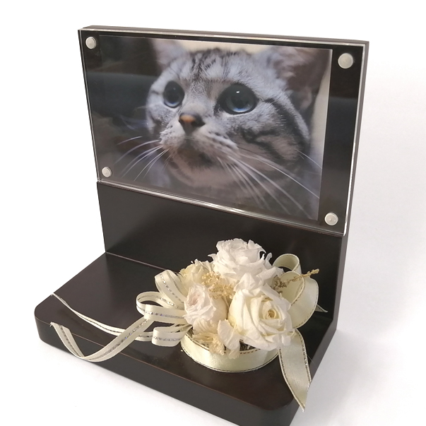 | 商品説明 | 【商品コード:2472】 ■商品詳細 ●商品サイズ:高さ約15.5cm×幅約15cm×奥行約9cm 大切なペットのご供養に、思い出の写真を飾り小さな骨壺や思い出の品などが置ける供養台となっております。 コンパクトなサイズで、小さなスペースにも置け、シンプルな飽きのこないデザインとなっております。 写真を入れるガラス面は、マグネット式となっており取り外しが簡単にできます。 造花は、台座に固定されています。 |