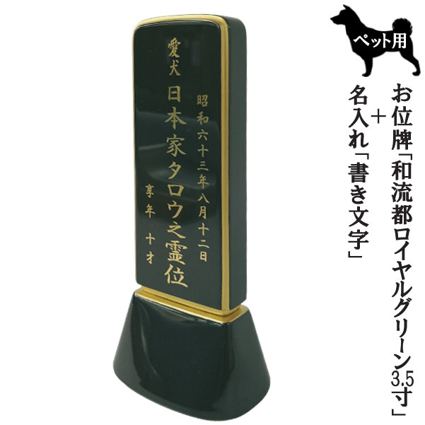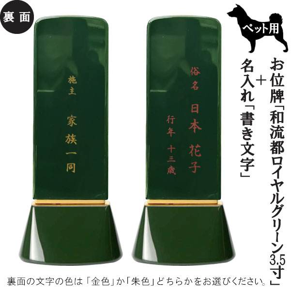| 商品説明 | 【商品番号:2489】 ペット用のお位牌として、3.5寸サイズのコンパクトなお位牌に書き文字をセットにしました。 お位牌は、デザイナーと職人がこだわり試行錯誤してつくり上げた曲面形状が美しい和流都シリーズを使用。 天然材を使用し熟練の職人による塗り・研磨・金粉撒きまでを国内生産することにこだわったお位牌となっております。 また、底面には、お仏壇に小キズが付かないようにフェルトが貼られた丁寧な作りになっています。 ※ご連絡事項に次の内容をご記入ください。 ●表面の書き文字の内容 ●裏面の書き文字の内容 ●裏面の書き文字の色 金色/朱色 ■商品詳細 ●お位牌の色 「ロイヤルグリーン」 ●文字 「書き文字」 ●文字の色 表面「金色」/ 裏面「金色」か「朱色」 ※西暦表記でも承ります。 ※数字は全て漢数字になります。 ●商品サイズ 位牌サイズ:高さ約14.2cm×奥行約4cm×幅約6cm |