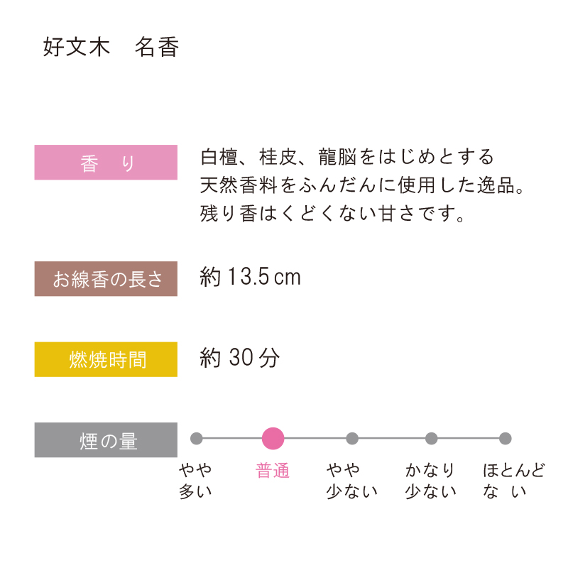 | 商品説明 | 【商品コード:1466】 ■商品詳細 ●内容量:約170g(約470本) ●お線香の長さ:約13.5cm ●煙量:普通 ●燃焼時間:約30分/1本 ●パッケージサイズ:長さ15×幅9.5×高さ4cm ※燃焼時間は、場所・気候(室内状態)により変化致します。 名前の由来は、中国の故事により「文を好む平和の花」として讃え命名された梅の美称。白檀、桂皮、龍脳をはじめとする天然香料をふんだんに使用した逸品です。 100年前に誕生したお線香「好文木」は日本全国だけでなく海外のファンにも愛されています。 残り香はくどくない甘さです。 |