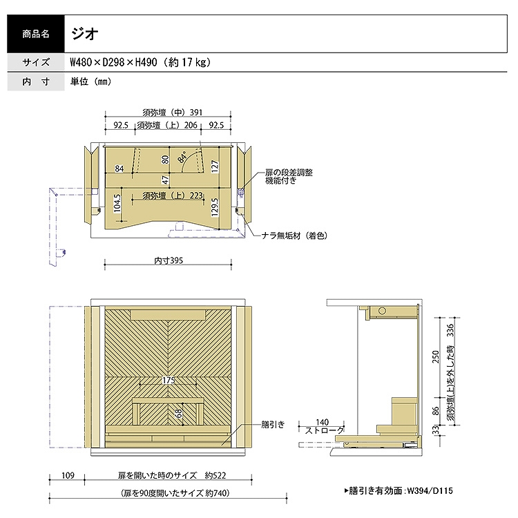 | 商品説明 | 【商品コード:2533】 ■材質詳細 ・材質/ナラ、ホワイトオーク ・仕上/ウレタン塗装 ・照明/LED ・仕様/須弥壇の取り外し可能、マグネットヒンジ(PAT.)使用、ストレートヒンジ使用 ■宗派 どの宗派でもお使いいただけます。 ■備考 ・掲載写真の仏具などの組み合わせは一例で別売りとなります。 おしゃれな矢張りの扉は開けるとサイドにすっきりと収まり省スペースです。 |