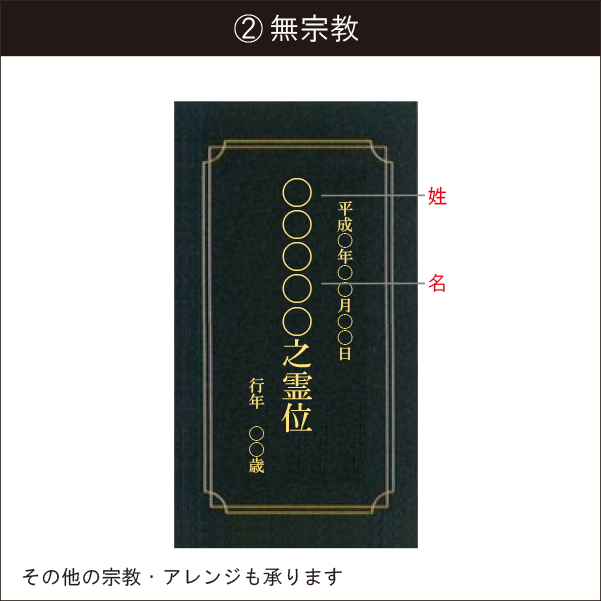 | 商品説明 | 【商品番号:2592】 マインドアルテ専用差板となります。 マインドアルテには戒名を入れるための札板が一枚付属しますが、もう一方の面にも札板を入れる事ができます。ご夫婦、ご兄弟の戒名やご先祖様をおまつりいただく際に2枚目のプレートとしてこちらをご注文ください。 こちらの商品は、1枚のプレートにお一人彫りのみの制作になります。 ※お位牌への文字彫り代金(1名分)を含んだ価格となっております。 ■商品詳細 ●サイズ:本体 : H110 × W62 × D1mm ●文字:彫文字 ●文字の色:「金色」 ※彫文字は、お客様に彫文字の原稿確認をして頂き、文字確認原稿確定後約2週間後の納品となりますので、余裕をもってご注文ください。 ---------------------------- 一度彫った文字は修正ができませんので、必ず下記をよく読んで文字の名入れをお知らせください。 【ご用意いただくもの】 戒名、没年月日、俗名(故人のお名前)、没年齢(故人の年齢)が分かる「白木位牌」「戒名用紙」を写真に撮ってご注文後メールにてお送りください。 メールはタイトルを「彫文字用、戒名・白木位牌写真」として、「注文者のお名前」「お電話番号」「今回ご購入の商品名」をご記入ください。 メールドレス sales@nihondou.co.jp 【オプション選択にて以下の内容をご入力ください】 ●ご希望納期 ●法要日 ●宗派 ●お位牌に入れる文字 戒名・法名 俗名(故人のお名前) 没年齢(故人の年齢) 没年月日 ●文字の色/金色 ●ご希望のレイアウトのパターン 【納期について】 納期は、お客様に彫文字の原稿確認をして頂き、文字確認原稿確定後「メーカー営業日の約2週間後の発送」となります。原稿の確認にもお時間を要します。余裕をもってご注文ください。 【原稿について】 基本的に弊社では「白木位牌」や「戒名用紙」に沿って原稿を作製致します。 故人の年齢の行年・享年の入れ方や戒名の下に「位」を入れるなど、先祖位牌に合わせて白木位牌より変更する場合があります。 また、以下のご説明では一般的な文字入れを記しておりますが、あくまでも一例です。どの文字を入れる・入れないというご指定は「お客様やご住職の判断」となります。事前に菩提寺やご住職にご相談の上、お入れする文字をご確認ください。 (弊社で作成した原稿を、菩提寺やご住職にご確認いただくと確実かと存じます) 【文字入れについて】 機械彫は札板に機械で文字を彫り、そこに金を箔押しします。 しっかりと彫られているため経年劣化が少なく、文字の美しさが長持ちします。 【お位牌にお入れする文字】 ■戒名・法名 先代のお位牌に合わせるなど、戒名の下に「位」や「霊位」などを付ける場合は、ご入力の際に「位」や「霊位」までご入力ください。 ・真言宗は、一般的には大日如来を示す梵字の「ア」字を記入してます。 ・白木位牌に入っている「新帰元」「帰元」「新円寂」などの文字は一般的に本位牌には入れません。 ・一戒名のお値段です。二名彫りより別途料金が発生します。 ■俗名(故人のお名前) ・生前の名前を入れ、一般的には名前の上に「俗名」と記入します。 ■没年齢(故人の年齢) 没年齢を記載の際は、以下の点をご注意ください。 ・先祖位牌に「行年」とあり、白木の位牌に「享年」とある場合等、先祖位牌に合わせて行年・享年を変更する場合があります。お寺様によって没年例の数え方が違うので、ご不明な点は菩提寺やご住職にお尋ねください。 記入例)「行年〇〇才」「行年〇〇歳」「享年〇〇才」「享年〇〇歳」「(行年・享年を付けない)〇〇才」「(行年・享年を付けない)〇〇歳」「(その他の文言)〇〇才」「(その他の文言)〇〇歳」「行年〇〇(才・歳を付けない)」「享年〇〇(才・歳を付けない)」等々 ■没年月日 亡くなった日を記入します。 ・白木の位牌の年月日の下に「没」「寂」などの文字が書かれている場合は一般的には省きます。 【梵字について】 梵字は、真言宗なら「ア」・浄土宗なら「キリーク」・浄土真宗なら「法名」など、宗派により異なり、さらに地域によっては入れない場合があるなど様々です。 ご不明な点は菩提寺やご住職にお尋ねください。 【文字の色について】 ●文字の色:「金色」 |