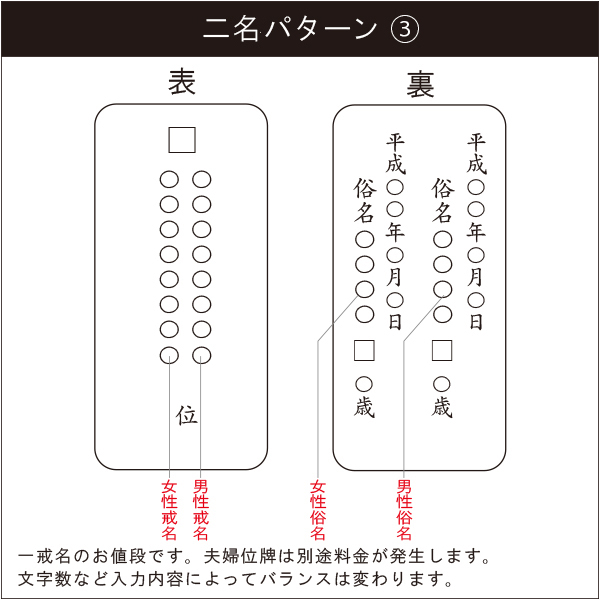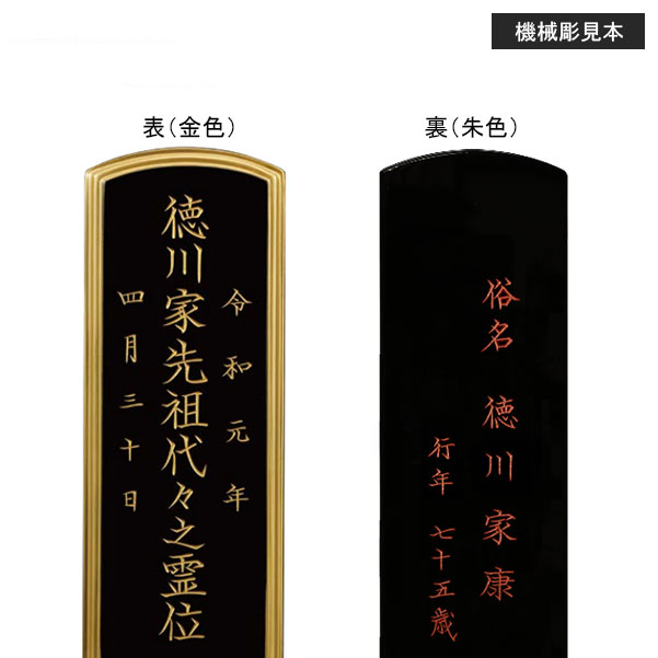 | 商品説明 | 【商品番号:2609】 お位牌本体ではありません。 必ずお位牌と一緒にご注文ください。 一度彫った文字は修正ができませんので、必ず下記をよく読んで文字の名入れをお知らせください。 【ご用意いただくもの】 戒名、没年月日、俗名(故人のお名前)、没年齢(故人の年齢)が分かる「白木位牌」「戒名用紙」を写真に撮ってご注文後メールにてお送りください。 メールはタイトルを「彫文字用、戒名・白木位牌写真」として、「注文者のお名前」「お電話番号」「今回ご購入の商品名」をご記入ください。 メールドレス sales@nihondou.co.jp 【オプション選択にて以下の内容をご入力ください】 ●ご希望納期 ●法要日 ●宗派 ●お位牌に入れる文字 戒名・法名 俗名(故人のお名前) 没年齢(故人の年齢) 没年月日 ●文字の色/表面 色、裏面 色 ●ご希望のレイアウトのパターン 【納期について】 納期は、お客様に彫文字の原稿確認をして頂き、文字確認原稿確定後「メーカー営業日の約2週間後の発送」となります。原稿の確認にもお時間を要します。余裕をもってご注文ください。 【原稿について】 基本的に弊社では「白木位牌」や「戒名用紙」に沿って原稿を作製致します。 故人の年齢の行年・享年の入れ方や戒名の下に「位」を入れるなど、先祖位牌に合わせて白木位牌より変更する場合があります。 また、以下のご説明では一般的な文字入れを記しておりますが、あくまでも一例です。どの文字を入れる・入れないというご指定は「お客様やご住職の判断」となります。事前に菩提寺やご住職にご相談の上、お入れする文字をご確認ください。 (弊社で作成した原稿を、菩提寺やご住職にご確認いただくと確実かと存じます) 【文字入れについて】 機械彫は札板に機械で文字を彫り、そこに金を箔押しします。 しっかりと彫られているため経年劣化が少なく、文字の美しさが長持ちします。 【お位牌にお入れする文字】 ■戒名・法名 先代のお位牌に合わせるなど、戒名の下に「位」や「霊位」などを付ける場合は、ご入力の際に「位」や「霊位」までご入力ください。 ・真言宗は、一般的には大日如来を示す梵字の「ア」字を記入してます。 ・白木位牌に入っている「新帰元」「帰元」「新円寂」などの文字は一般的に本位牌には入れません。 ・一戒名のお値段です。二名彫りより別途料金が発生します。 ■俗名(故人のお名前) ・生前の名前を入れ、一般的には名前の上に「俗名」と記入します。 ■没年齢(故人の年齢) 没年齢を記載の際は、以下の点をご注意ください。 ・先祖位牌に「行年」とあり、白木の位牌に「享年」とある場合等、先祖位牌に合わせて行年・享年を変更する場合があります。お寺様によって没年例の数え方が違うので、ご不明な点は菩提寺やご住職にお尋ねください。 記入例)「行年〇〇才」「行年〇〇歳」「享年〇〇才」「享年〇〇歳」「(行年・享年を付けない)〇〇才」「(行年・享年を付けない)〇〇歳」「(その他の文言)〇〇才」「(その他の文言)〇〇歳」「行年〇〇(才・歳を付けない)」「享年〇〇(才・歳を付けない)」等々 ■没年月日 亡くなった日を記入します。 ・白木の位牌の年月日の下に「没」「寂」などの文字が書かれている場合は一般的には省きます。 【梵字について】 梵字は、真言宗なら「ア」・浄土宗なら「キリーク」・浄土真宗なら「法名」など、宗派により異なり、さらに地域によっては入れない場合があるなど様々です。 ご不明な点は菩提寺やご住職にお尋ねください。 【文字の色について】 一般的には全て金色です。 ・金・朱・白・群青(位牌の札板の表が総金の場合)の4色からお選びいただけます。 ・表面:金文字が一般的です。 ・裏面:金文字が一般的です。 関東圏では、裏面に俗名・行年を入れて朱色を使う事が多いようです。 【家紋入れ】 家紋をお位牌に入れることでそのお家を表し、格式高くなります。 ・家紋入れは別途料金が発生します。 ・家紋部分のみ彫ではなく「書き」になります。 |