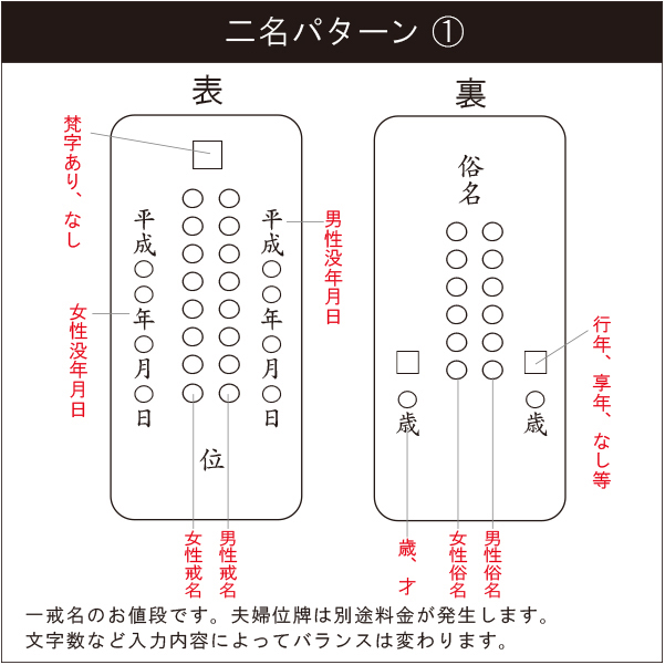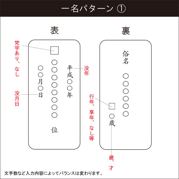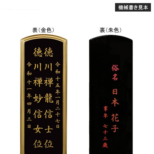 | 商品説明 | 【商品番号:2613】 お位牌本体ではありません。 必ずお位牌と一緒にご注文ください。 一度書いた文字は修正ができませんので、必ず下記をよく読んで文字の名入れをお知らせください。 【ご用意いただくもの】 戒名、没年月日、俗名(故人のお名前)、没年齢(故人の年齢)が分かる「白木位牌」「戒名用紙」を写真に撮ってご注文後メールにてお送りください。 メールはタイトルを「書き文字用、戒名・白木位牌写真」として、「注文者のお名前」「お電話番号」「今回ご購入の商品名」をご記入ください。 メールドレス sales@nihondou.co.jp 【オプション選択にて以下の内容をご入力ください】 ●ご希望納期 ●法要日 ●宗派 ●お位牌に入れる文字 戒名・法名 俗名(故人のお名前) 没年齢(故人の年齢) 没年月日 ●文字の色/表面 色、裏面 色 ●ご希望のレイアウトのパターン 【納期について】 納期は、お客様に書き文字の原稿確認をして頂き、文字確認原稿確定後「メーカー営業日の約2週間後の発送」となります。原稿の確認にもお時間を要します。余裕をもってご注文ください。 【原稿について】 基本的に弊社では「白木位牌」や「戒名用紙」に沿って原稿を作製致します。 故人の年齢の行年・享年の入れ方や戒名の下に「位」を入れるなど、先祖位牌に合わせて白木位牌より変更する場合があります。 また、以下のご説明では一般的な文字入れを記しておりますが、あくまでも一例です。どの文字を入れる・入れないというご指定は「お客様やご住職の判断」となります。事前に菩提寺やご住職にご相談の上、お入れする文字をご確認ください。 (弊社で作成した原稿を、菩提寺やご住職にご確認いただくと確実かと存じます) 【文字入れについて】 機械書きは札板に機械で箔(色のつく薄いシート)をなぞって文字を転写するので、文字はやわらかく整っている印象です。 長年使い、拭いたりしていると字が薄れていくことがあります。 【お位牌にお入れする文字】 ■戒名・法名 先代のお位牌に合わせるなど、戒名の下に「位」や「霊位」などを付ける場合は、ご入力の際に「位」や「霊位」までご入力ください。 ・真言宗は、一般的には大日如来を示す梵字の「ア」字を記入してます。 ・白木位牌に入っている「新帰元」「帰元」「新円寂」などの文字は一般的に本位牌には入れません。 ・一戒名のお値段です。二名書きより別途料金が発生します。 ■俗名(故人のお名前) ・生前の名前を入れ、一般的には名前の上に「俗名」と記入します。 ■没年齢(故人の年齢) 没年齢を記載の際は、以下の点をご注意ください。 ・先祖位牌に「行年」とあり、白木の位牌に「享年」とある場合等、先祖位牌に合わせて行年・享年を変更する場合があります。お寺様によって没年例の数え方が違うので、ご不明な点は菩提寺やご住職にお尋ねください。 記入例)「行年〇〇才」「行年〇〇歳」「享年〇〇才」「享年〇〇歳」「(行年・享年を付けない)〇〇才」「(行年・享年を付けない)〇〇歳」「(その他の文言)〇〇才」「(その他の文言)〇〇歳」「行年〇〇(才・歳を付けない)」「享年〇〇(才・歳を付けない)」等々 ■没年月日 亡くなった日を記入します。 ・白木の位牌の年月日の下に「没」「寂」などの文字が書かれている場合は一般的には省きます。 【梵字について】 梵字は、真言宗なら「ア」・浄土宗なら「キリーク」・浄土真宗なら「法名」など、宗派により異なり、さらに地域によっては入れない場合があるなど様々です。 ご不明な点は菩提寺やご住職にお尋ねください。 【文字の色について】 一般的には全て金色です。 ・金・朱・白・群青(位牌の札板の表が総金の場合)の4色からお選びいただけます。 ・表面:金文字が一般的です。 ・裏面:金文字が一般的です。 関東圏では、裏面に俗名・行年を入れて朱色を使う事が多いようです。 【家紋入れ】 家紋をお位牌に入れることでそのお家を表し、格式高くなります。 ・家紋入れは別途料金が発生します。 ・家紋部分は「書き」のみの対応になります。 |
