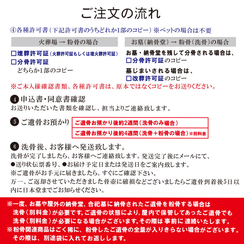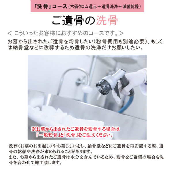 | 商品説明 | 【商品コード:2692】 骨壷直径18~21cm(6~7寸)の洗骨 (六価クロム還元・遺骨洗浄・滅菌乾燥)料金となります。(粉骨代は別) 改葬(お墓のお引越し)やお墓じまいをし、納骨堂などにご遺骨を再安置する際、遺骨の乾燥や洗浄が求められることがあります。 また、お墓から出されたご遺骨は水分を含んでいるため、粉骨をご希望の場合も洗骨を合わせて施工致します。 ■詳細 ・骨壷直径18~21cm(6~7寸)の洗骨 ※粉骨代は別(粉骨もご希望の場合は、別途粉骨もご注文ください) ・期間:お預かり後約2週間(洗骨のみの場合) ・期間:お預かり後約4週間(洗骨+粉骨の場合) ■送骨梱包セット ご遺骨をお客様宅から弊社まで送付頂くための「送骨梱包セット 2、200円 (税込)」をご希望の方には発送(運賃は弊社負担)致します。 「オプション選択」よりお選び下さい。 ・送骨梱包セットの内容:ダンボール箱・緩衝材・ゆうパック送り状・取扱注意ステッカー・梱包方法の説明書・提出書類チェックシート |