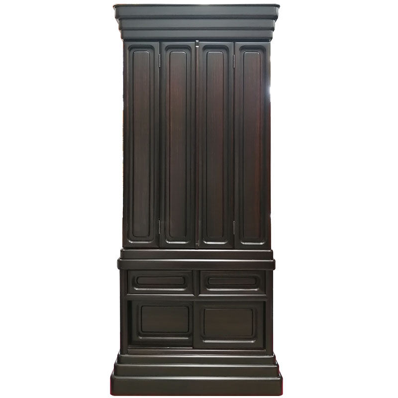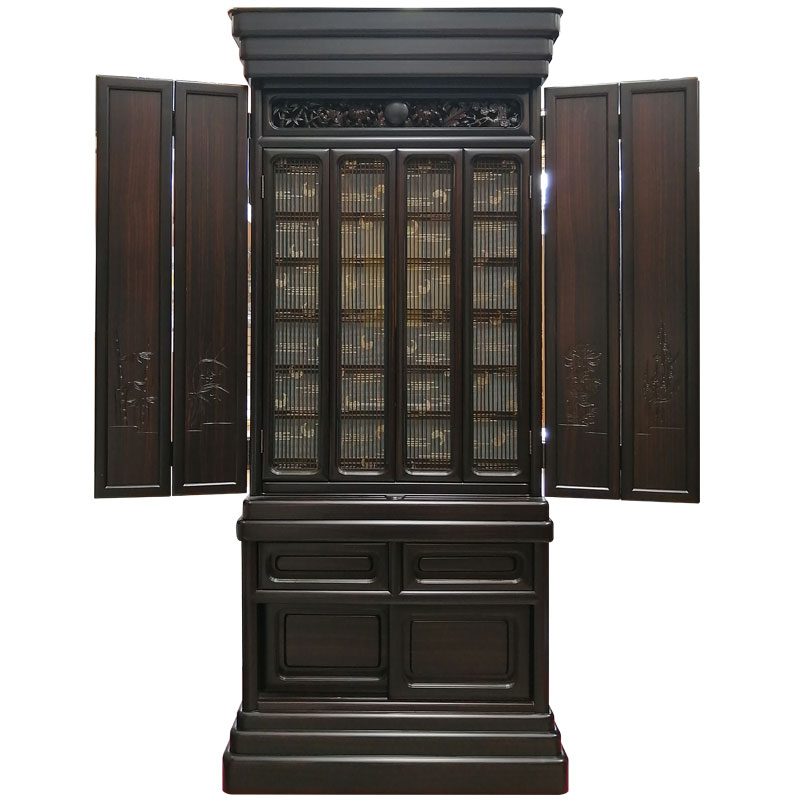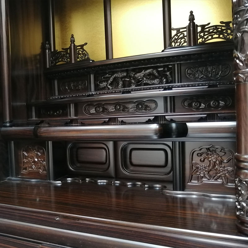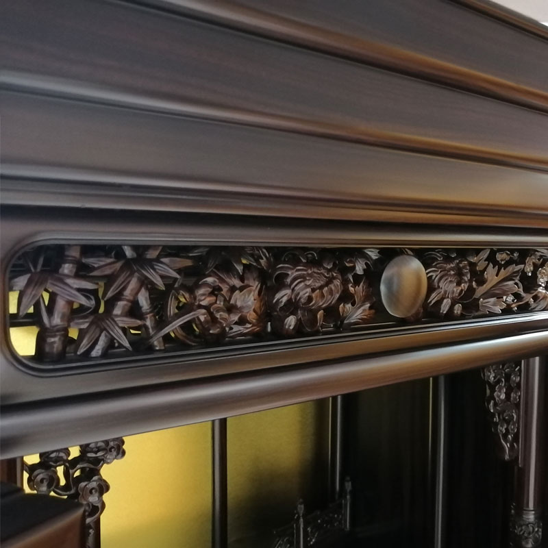 | 商品説明 | 【商品コード:2706】 ■材質詳細 ・笠、台輪/主材料:黒檀厚板貼り 芯材料:朴 ・戸板、扉/主材料:黒檀無垢 芯材料:黒檀無垢 ・大戸軸/主材料:黒檀厚板貼り 芯材料:朴 ・その他/表面仕上げ:摺漆仕上げ、生産地:日本 ■宗派 どの宗派でもお使いいただけます。 ■備考 ・商品は手作りの為、一部の色、デザイン、寸法が多少変更になる場合がございます。 最高級黒檀材を使用した東京仏壇のベストセラー。黒檀厚板無垢を証明する戸板裏レリーフが自慢の逸品です。半間仏間に最適です。 【東京仏壇:東京都伝統工芸品東京仏壇とは】 東京仏壇の歴史は、1603年に徳川家康が江戸に開府したことにはじまります。宗教政策の一環として仏寺の建立発展を進めた結果、八代将軍吉宗の時代には一般庶民が競って仏壇を祀るようになりました。その需要に応えるべく、江戸指物師や仏師が独自の技法をつぎこみ仏壇をこしらえたのが、東京仏壇の原型です。 その後、1840年ころからは東京仏壇に唐木が使われるようになり、木地本来の持ち味を生かしながら古典的な優美さも残した、丈夫で長持ちする実用本位の仏壇がつくられます。この伝統と技術を受け継いだ職人(伝統工芸士)が丹念に手づくりしたものが、現在わたしたちが目にする東京仏壇なのです。 現在、東京都伝統工芸品東京仏壇には伝統工芸品である証の伝産マークとシリアルナンバーが記された証紙(シール)が貼付されております。お求めの際はこの証紙をお確かめの上、類似品にはご注意ください。 |