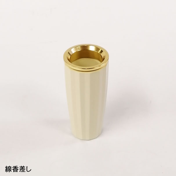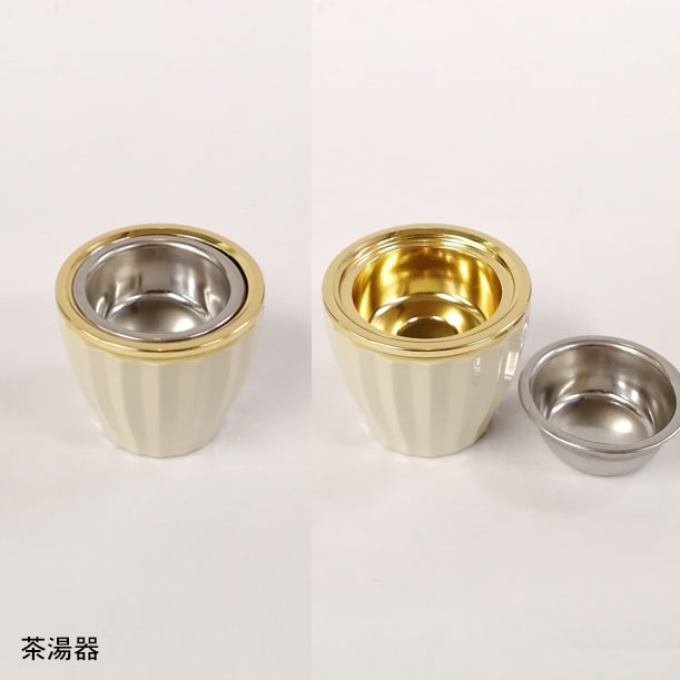 | 商品説明 | 【商品コード:2743】 ■材質詳細 ・セット内容:花立・線香立て・前香炉・灯立・茶湯器(お水・お茶用)・仏飯器(ご飯用) ・サイズ:3寸 花立/φ5.7cm、高さ9cm 線香立て/φ3.6cm、高さ7.2cm 前香炉/φ9cm、高さ5.1cm 灯立/φ5.2cm、高さ4cm 茶湯器/φ5cm、高さ4.1cm 仏飯器/φ5.2cm、高さ3.1cm ・主素材/真鍮 ■宗派 どの宗派でもお使いいただけます。 ■備考 ※類似品にご注意ください。 美しいフォルムに立体的なラインがシャープな印象を演出。 しっかりとした重量と安定感、高級感のある光沢が特徴の仏具となっております。 お仏壇に馴染みやすく、コーディネートしやすい6点セットの仏具となります。 茶湯器と仏飯器には錆びにくく耐久性のあるステンレス製の「落とし」がついています。 取り外してご飯やお水等の交換が出来るので、仏具を汚すことなくお手入れが簡単です。 |