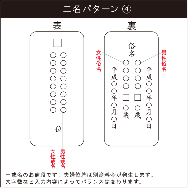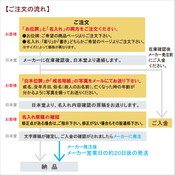 | 商品説明 | 【商品番号:2767】 お位牌本体ではありません。 必ずお位牌と一緒にご注文ください。 一度書いた文字は修正ができませんので、必ず下記をよく読んで文字の名入れをお知らせください。 【ご用意いただくもの】 戒名、没年月日、俗名(故人のお名前)、没年齢(故人の年齢)が分かる「白木位牌」「戒名用紙」を写真に撮ってご注文後メールにてお送りください。 メールはタイトルを「書き文字用、戒名・白木位牌写真」として、「注文者のお名前」「お電話番号」「今回ご購入の商品名」をご記入ください。 メールドレス sales@nihondou.co.jp 【オプション選択にて以下の内容をご入力ください】 ●ご希望納期 ●法要日 ●宗派 ●お位牌に入れる文字 戒名・法名 俗名(故人のお名前) 没年齢(故人の年齢) 没年月日 ●文字の色/表面 色、裏面 色 ●ご希望のレイアウトのパターン 【納期について】 納期は、お客様に書き文字の原稿確認をして頂き、文字確認原稿確定後「メーカー営業日の約20日後の発送」となります。原稿の確認にもお時間を要します。余裕をもってご注文ください。 【原稿について】 基本的に弊社では「白木位牌」や「戒名用紙」に沿って原稿を作製致します。 故人の年齢の行年・享年の入れ方や戒名の下に「位」を入れるなど、先祖位牌に合わせて白木位牌より変更する場合があります。 また、以下のご説明では一般的な文字入れを記しておりますが、あくまでも一例です。どの文字を入れる・入れないというご指定は「お客様やご住職の判断」となります。事前に菩提寺やご住職にご相談の上、お入れする文字をご確認ください。 (弊社で作成した原稿を、菩提寺やご住職にご確認いただくと確実かと存じます) 【文字入れについて】 機械書きは札板に機械で箔(色のつく薄いシート)をなぞって文字を転写するので、文字はやわらかく整っている印象です。 長年使い、拭いたりしていると字が薄れていくことがあります。 【お位牌にお入れする文字】 ■戒名・法名 先代のお位牌に合わせるなど、戒名の下に「位」や「霊位」などを付ける場合は、ご入力の際に「位」や「霊位」までご入力ください。 ・真言宗は、一般的には大日如来を示す梵字の「ア」字を記入してます。 ・白木位牌に入っている「新帰元」「帰元」「新円寂」などの文字は一般的に本位牌には入れません。 ・一戒名のお値段です。二名書きより別途料金が発生します。 ■俗名(故人のお名前) ・生前の名前を入れ、一般的には名前の上に「俗名」と記入します。 ■没年齢(故人の年齢) 没年齢を記載の際は、以下の点をご注意ください。 ・先祖位牌に「行年」とあり、白木の位牌に「享年」とある場合等、先祖位牌に合わせて行年・享年を変更する場合があります。お寺様によって没年例の数え方が違うので、ご不明な点は菩提寺やご住職にお尋ねください。 記入例)「行年〇〇才」「行年〇〇歳」「享年〇〇才」「享年〇〇歳」「(行年・享年を付けない)〇〇才」「(行年・享年を付けない)〇〇歳」「(その他の文言)〇〇才」「(その他の文言)〇〇歳」「行年〇〇(才・歳を付けない)」「享年〇〇(才・歳を付けない)」等々 ■没年月日 亡くなった日を記入します。 ・白木の位牌の年月日の下に「没」「寂」などの文字が書かれている場合は一般的には省きます。 【梵字について】 梵字は、真言宗なら「ア」・浄土宗なら「キリーク」・浄土真宗なら「法名」など、宗派により異なり、さらに地域によっては入れない場合があるなど様々です。 ご不明な点は菩提寺やご住職にお尋ねください。 【文字の色について】 一般的には全て金色です。 ・金・朱・白・群青(位牌の札板の表が総金の場合)の4色からお選びいただけます。 ・表面:金文字が一般的です。 ・裏面:金文字が一般的です。 関東圏では、裏面に俗名・行年を入れて朱色を使う事が多いようです。 【家紋入れ】 家紋をお位牌に入れることでそのお家を表し、格式高くなります。 ・家紋入れは別途料金が発生します。 ・家紋部分は「書き」のみの対応になります。 |