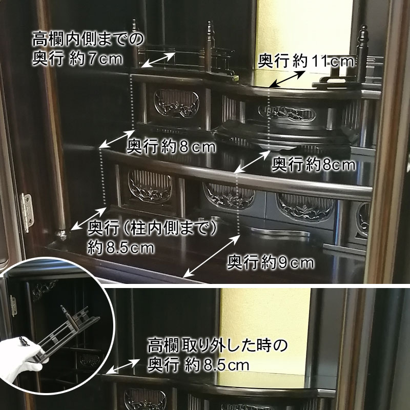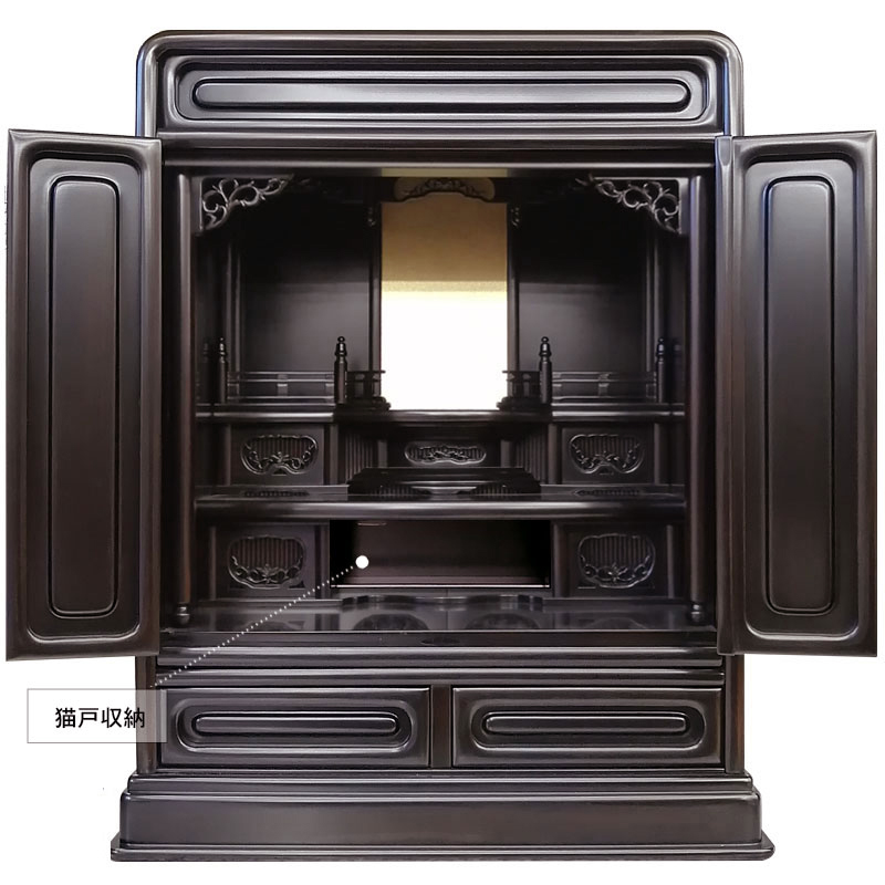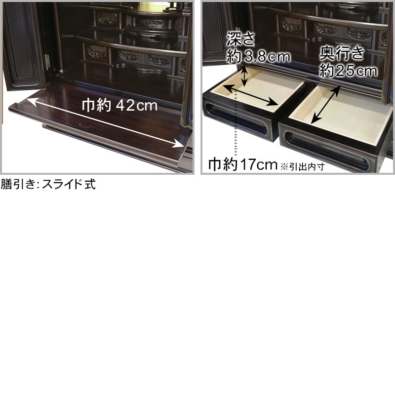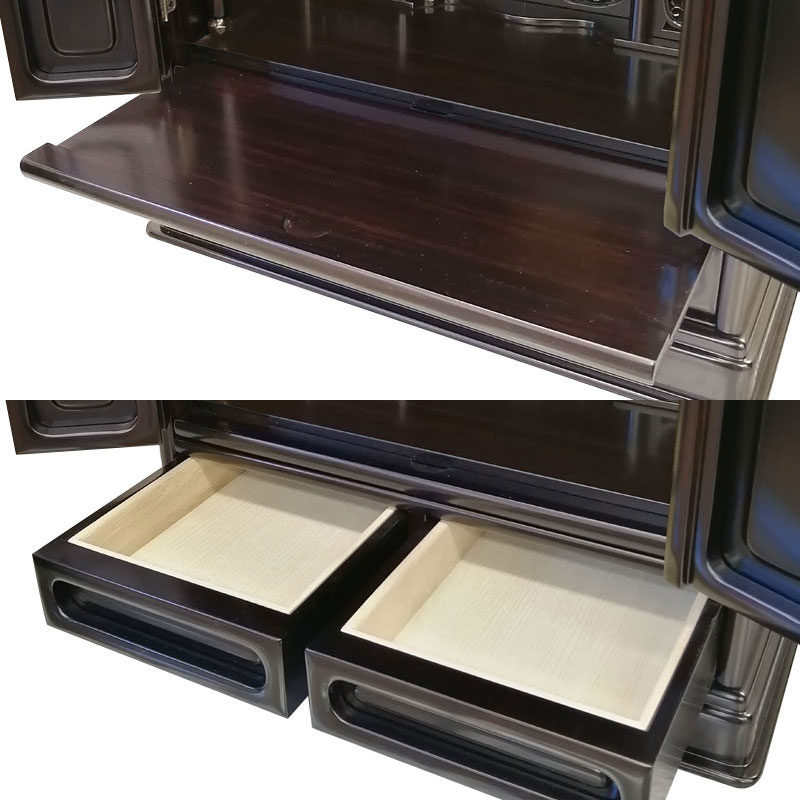 | 商品説明 | 【商品コード:2836】 ◎日本堂オリジナル ■材質詳細 ・笠、台輪/主材料:紫檀系(ブビンガ)薄板貼り 芯材料:MDF ・戸板、扉/主材料:紫檀系(ブビンガ)薄板貼り 芯材料:MDF ・大戸軸/主材料:紫檀系(ブビンガ)薄板貼り 芯材料:MDF ・その他/表面仕上げ:ラッカー仕上、生産地:海外 ■宗派 どの宗派でもお使いいただけます。 ■備考 ・商品は手作りの為、一部の色、デザイン、寸法が多少変更になる場合がございます。 コンパクトな唐木仏壇で、扉の蝶番が本体の内側についているため、他のお仏壇より開いた時の巾をとらない造りとなっております。 照明が無くても掛軸や仏像が映えるよう、背板中央に金紙を施しました。 また、須弥壇が半円状(丸出須弥壇)にせり出しているのでご本尊もすっきりと安置出来ます。 収納は、左右に分かれていて桐の落しが入っている引き出しに加えて、内陣にはご本尊に一番近い収納スペース(猫戸)があり、御遺品などを収納できます。 紫檀薄板貼りで、とてもお得な商品となっております。 |