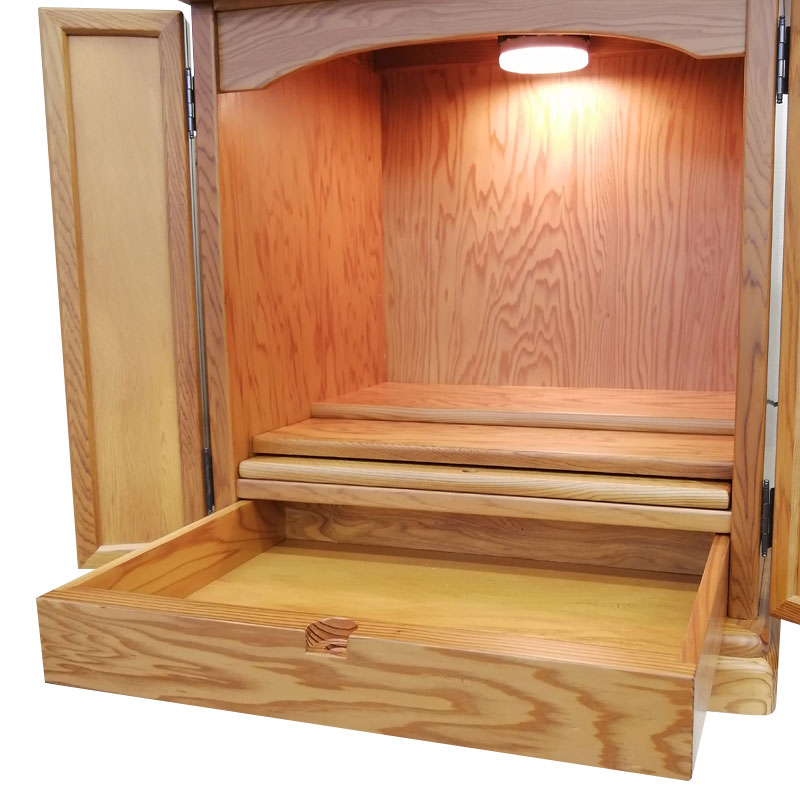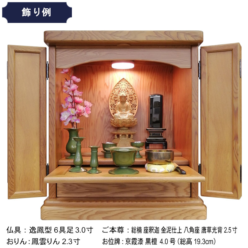 | 商品説明 | 【商品コード:2902】 ■材質詳細 ・笠、台輪/主材料:屋久杉無垢 芯材料:屋久杉無垢 ・戸板、扉/主材料:屋久杉無垢 芯材料:屋久杉無垢 ・大戸軸/主材料:朴(ほうのき) 芯材料:屋久杉厚板貼り ・その他/表面仕上げ:摺漆仕上げ、生産地:日本 ■宗派 どの宗派でもお使いいただけます。 ■備考 ・商品は手作りの為、一部の色、デザイン、寸法が多少変更になる場合がございます。 ・天然木のため一品一品の木目が異なります。 こちらのお仏壇は国の特別天然記念物に指定されている希少材の屋久杉を使用した伝統芸仏壇でございます。 彫などの装飾を出来るだけ省き、シンプルなデザインにすることで、東京仏壇の屋久杉を使用したお仏壇でこの価格が実現しました。 屋久杉は鹿児島県屋久島にて樹齢千年以上の樹木に与えられる称号で、同じ屋久島にある杉材でもその樹齢により名称が変わる木材です。また、特別天然物指定を受けている木材なので、伐採することは許されておらず自然倒木したものだけが製材され市場に出荷されるため安定供給することが不可能なため希少材とされています。 近年の異常気象による超大型台風などの影響で樹齢千年を待たずして倒木してしまうものもあり、屋久杉の稀少性は今後更に上がるとされております。 こちらのお仏壇はその稀少な屋久杉材の無垢・厚板を贅沢に使用したお仏壇です。 【東京仏壇:東京都伝統工芸品東京仏壇とは】 東京仏壇の歴史は、1603年に徳川家康が江戸に開府したことにはじまります。宗教政策の一環として仏寺の建立発展を進めた結果、八代将軍吉宗の時代には一般庶民が競って仏壇を祀るようになりました。その需要に応えるべく、江戸指物師や仏師が独自の技法をつぎこみ仏壇をこしらえたのが、東京仏壇の原型です。 その後、1840年ころからは東京仏壇に唐木が使われるようになり、木地本来の持ち味を生かしながら古典的な優美さも残した、丈夫で長持ちする実用本位の仏壇がつくられます。この伝統と技術を受け継いだ職人(伝統工芸士)が丹念に手づくりしたものが、現在わたしたちが目にする東京仏壇なのです。 現在、東京都伝統工芸品東京仏壇には伝統工芸品である証の伝産マークとシリアルナンバーが記された証紙(シール)が貼付されております。お求めの際はこの証紙をお確かめの上、類似品にはご注意ください。 |