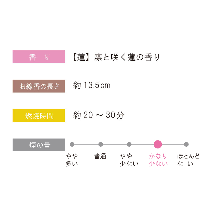 | 商品説明 | 【商品コード:2909】 ■商品詳細 ●【蓮】凛と咲く蓮の香り ●内容量:お香(ロングタイプ)40本 アルミ香立1個 ●お線香の長さ:約13.5cm ●燃焼時間:約20-30分(1本あたり)(煙の少ないタイプ) ●パッケージサイズ:長さ15.7×幅3.5×高さ2.0cm ※燃焼時間は、場所・気候(室内状態)により変化致します。 ※付属の香立てをご使用の際は、灰を受ける不燃性のお皿などの上に置いてからお使いください。 御仏前用のお線香なども製造している香匠たちが手掛けたスティック型の室内香です。 厳選された天然白檀と原料を調合した大変上質なお香となっております。 リモートワークやオンライン授業などで、 自宅で過ごす時間をより豊かにしたいという方のご利用が増えています。 |