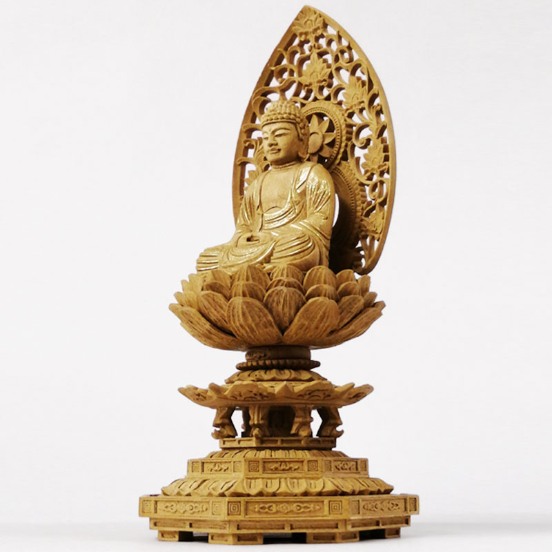 | 商品説明 | 【商品コード:2922】 ■商品詳細 ●寸法3.0寸:総高さ 約30.2cm、幅 約15.5cm、奥行 約13.2cm ●材質:楠 ●宗派:禅宗(臨済宗・曹洞宗) ■備考 ※手作り品のため寸法は、おおよその数値です。 ※自然木を使用した手彫り仕上げのため、一体一体仕上がりや木目・色味が異なる場合があります。 また、年を重ねると色目が変わって(濃く)きます。 ・お取り寄せ商品となっております。在庫状況や納期はお問合せ下さい。 禅宗(臨済宗・曹洞宗)のご本尊として祀られる、楠製の御仏像です。 楠は、樹齢が千年を超える木もあり、信仰の対象として多くの神社仏閣の境内に植栽されています。材質は軟らかくて加工しやすく、磨くと光沢がでるという特徴があります。 また、樟脳(しょうのう)の原材料であり防虫効果があります。 金泥書きを施しているため非常に高級感が溢れた仕上がりとなっています。 光背に使われている唐草は、四方八方に伸びる様子から、仏教ではとても縁起が良いといわれています。 |