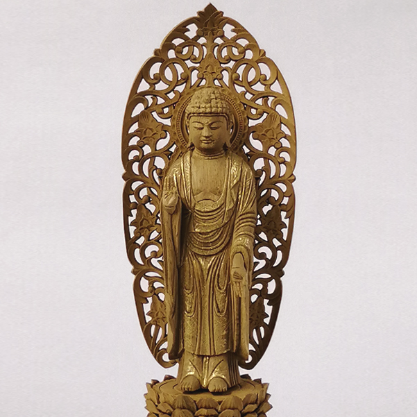 | 商品説明 | 【商品コード:2924】 ■商品詳細 ●寸法 3.5寸:総高さ 約24.5cm、幅 約8.7cm、奥行 約7.5cm ●材質:楠 ●宗派:浄土宗 ■備考 ※手作り品のため寸法は、おおよその数値です。 ※自然木を使用した手彫り仕上げのため、一体一体仕上がりや木目・色味が異なる場合があります。 また、年を重ねると色目が変わって(濃く)きます。 ・お取り寄せ商品となっております。在庫状況や納期はお問合せ下さい。 浄土宗のご本尊として祀られる、楠製の御仏像です。 楠は、樹齢が千年を超える木もあり、信仰の対象として多くの神社仏閣の境内に植栽されています。材質は軟らかくて加工しやすく、磨くと光沢がでるという特徴があります。 また、樟脳(しょうのう)の原材料であり防虫効果があります。 金泥書きを施しているため非常に高級感が溢れた仕上がりとなっています。 光背に使われている唐草は、四方八方に伸びる様子から、仏教ではとても縁起が良いといわれています。 |