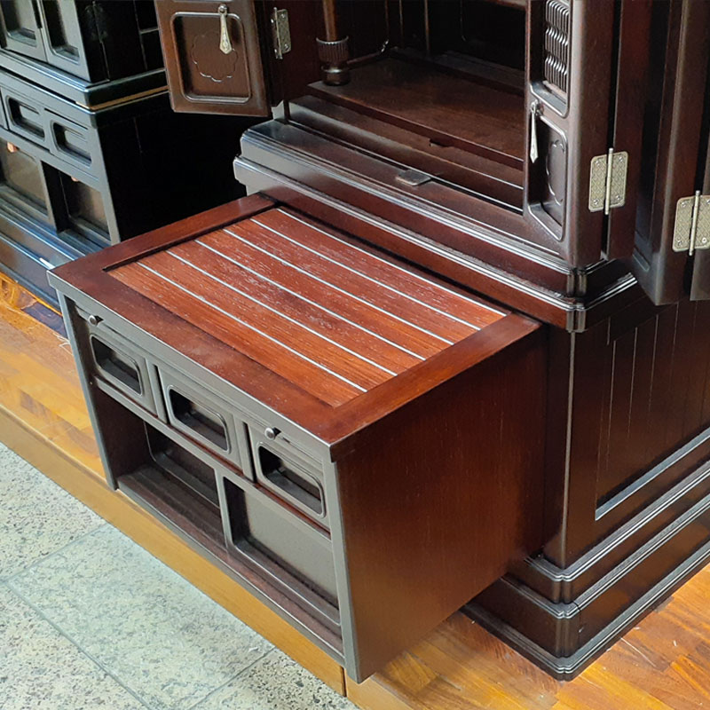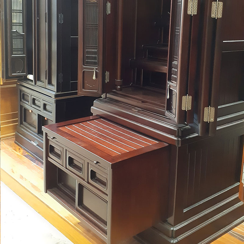 | 商品説明 | 【商品コード:2944】 ◎日本堂オリジナル ■材質詳細 ・笠、台輪/主材料:紫檀(ホンジュラローズ)厚板貼り 芯材料:ニヤトー ・戸板、扉/主材料:紫檀(ホンジュラローズ)無垢 芯材料:紫檀(ホンジュラローズ)無垢 ・大戸軸/主材料:紫檀(ホンジュラローズ)三方厚板貼り 芯材料:ニヤトー ・その他/表面仕上げ:ウレタンオープン仕上、生産地:日本 ■宗派 どの宗派でもお使いいただけます。 ■備考 ・商品は手作りの為、一部の色、デザイン、寸法が多少変更になる場合がございます。 日本堂が誇るオリジナル最高級仏壇シリーズ「極」。 威風堂々としたそのデザイン。また希少な紫檀(ホンジュラローズ)の厚板をふんだんに使用しております。 下台は収納式経机となっており、膳引きは上台はもとより、下台収納式経机にもあるので、お彼岸・お盆時期などお供物が多くなる季節は上台膳引き・収納式経机・経机膳引きと三段の違い棚としても使用でます。 膳引きや上台側面は短冊(フローリング)仕上げで手の込んだ造りとなっています。 天井部分は寺院建築と同じ折上げ格天井となっており、吊り空殿仕上なので御仏像がゆったりとお祀りいただけます。 内陣は無垢製高欄をはじめ、障子桟まで無垢製と希少材本黒檀を贅沢に使用し、隠し引出しも備えております。 下台の台輪部分は一杯引きの引出(桐落し付)をなっており、会葬者名簿やお着物など面積のある品々を収納することも可能です。 欄間は、無垢材で東洋画で古代より草木の中の君子と称えられる4種の草木(蘭・竹・菊・梅)が施された四君子彫仕上げになっております。 引出は高級仏壇の証、桐の落とし付で調湿効果・耐火性に優れ、遺品や念珠・お線香等の保管に最適な仕上げになっております。 |