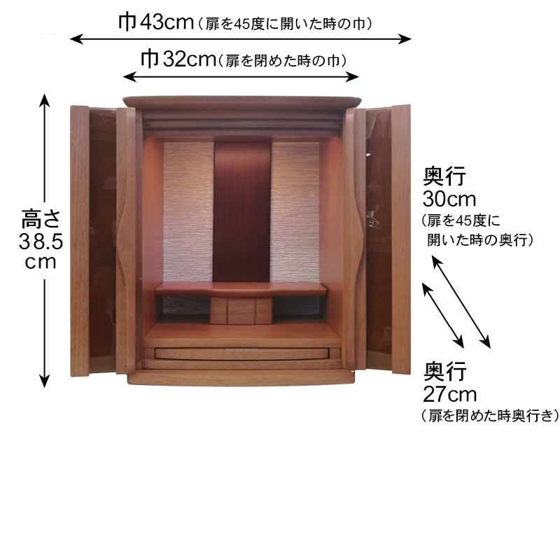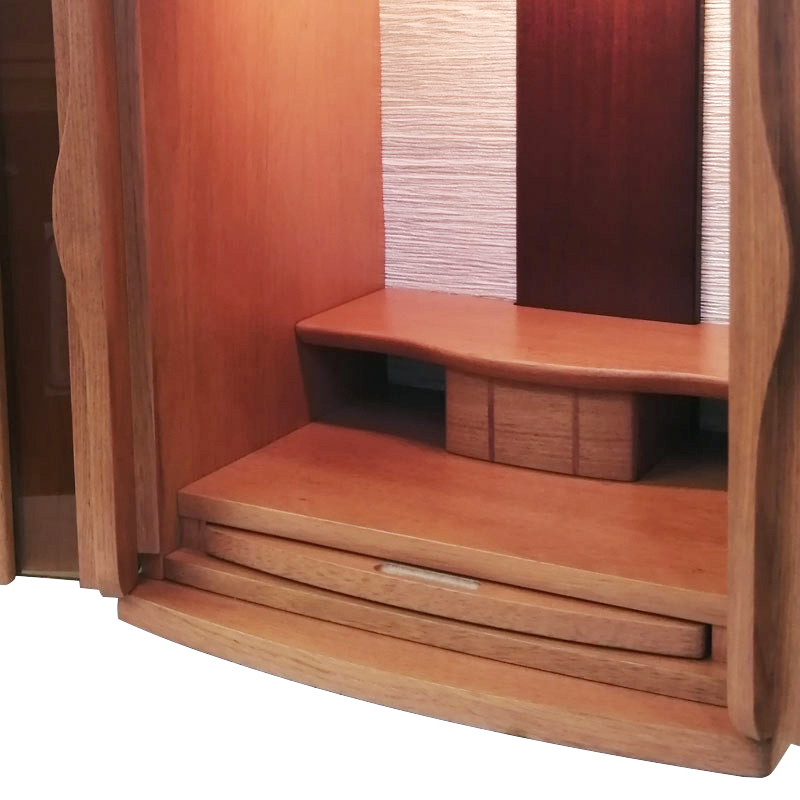| 商品説明 | 【商品番号:3053】 ◎日本堂オリジナル商品 ■材質詳細 ・笠、台輪/主材料:クルミ無垢 芯材料:クルミ ・戸板、扉/主材料:クルミ無垢 芯材料:クルミ ・その他/表面仕上げ:ウレタン仕上げ、生産地:日本 ■宗派 どの宗派でもお使いいただけます。 ■備考 ・商品は手作りの為、一部の色、デザイン、寸法が多少変更になる場合がございます。 コンパクトさが特徴の12号サイズのお仏壇となっております。 こちらのミニ仏壇は、胡桃の天然木を使用しており年月が経つごとに深みのある味わいをお楽しみいただけるお仏壇となっております。 扉にはアンバー色のガラスが設置されており、ガラス扉を閉めるとうっすらと中が見え、明るい雰囲気でご安置いただけます。 照明はLEDのテープライトを使用し、内欄間の裏側天井部分に設置されており正面からは見えない設計になっております。スイッチは、お仏壇裏側のコードに中間スイッチが設けられています。 内部の須弥壇は取り外しが可能で、ご本尊や掛軸の大きさに合わせて高さを変えることができます。また、お仏壇のお手入れがしやすく、奥の方の細かな部分まで、しっかりお手入れして頂くことが出来ます。 |