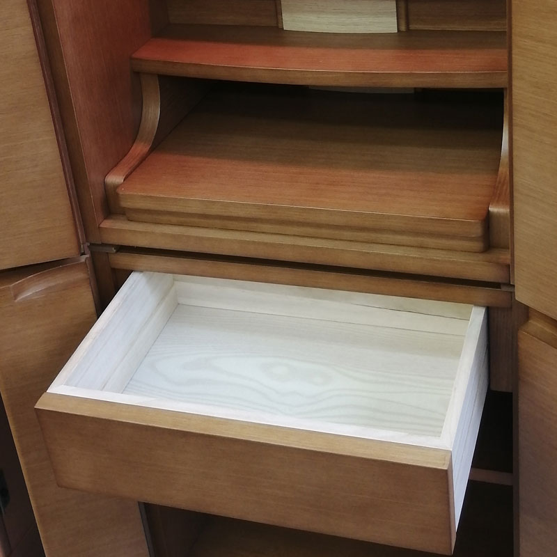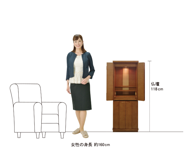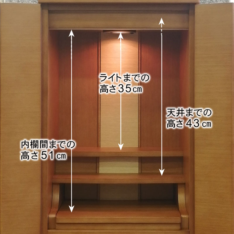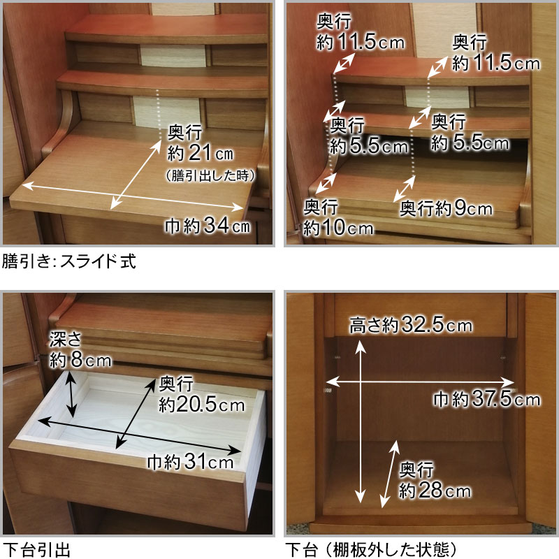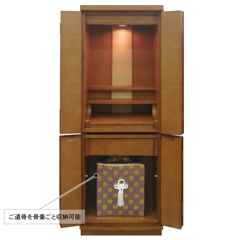 | 商品説明 | 【商品コード:3080】 ◎日本堂オリジナル商品 ■材質詳細 ・笠、台輪/主材料:タモ薄板貼り 芯材料:MDF ・戸板、扉/主材料:タモ薄板貼り 芯材料:MDF ・その他/表面仕上げ:ウレタン塗装、生産地:海外 ■宗派 どの宗派でもお使いいただけます。 ■備考 ・商品は手作りの為、一部の色、デザイン、寸法が多少変更になる場合がございます。 タモ材を表面材に使用し落ち着いた色合いで、総高さ118cmと現代の住宅事情に合わせて、台付タイプのお仏壇としてはコンパクトな40号サイズのお仏壇です。 膳引きは、スライド式となっており、お祀りいただいた仏具をそのまま中に収納して扉を閉めることができます。 下台部分には引出収納を完備し、お仏壇用品など十分な収納機能となっております。また、棚板を外すと、骨壷が収納できるスペースがありますので、納骨まで骨壺をご安置、または自宅墓としてもお使いいただけます。 内部照明には、ナツメ球を使用。暖かみのある色目でお仏壇内部を照らします。 |