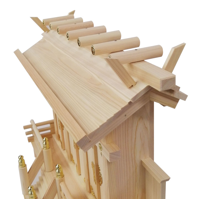 | 商品説明 | 【商品番号:3101】 ■商品詳細 【小】39、800円 ・外寸法:高さ約37cm×巾約52cm×奥行約22cm ・内部寸法:高さ約25cm×幅約32cm×奥行約5.5cm (小は内部に区切りがありません) ■備考 ・商品は手作りの為、一部の色、デザイン、寸法が多少変更になる場合がございます。 屋根がひとつですっきりとしたデザインの通し屋根三社です。 正面の扉は開け閉めができ、お神札が納めやすいように扉全体を手前に引くと扉を外すことが出来ます。 屋根の左右の千木は差し込み式で、社の回廊部分は三段の組高欄(くみこうらん)造りとなっております。 お札の納め方は、中心に「天照皇大神宮」向かって右側に「氏神様」左側に「崇敬神」と言う順でお納めします。 |