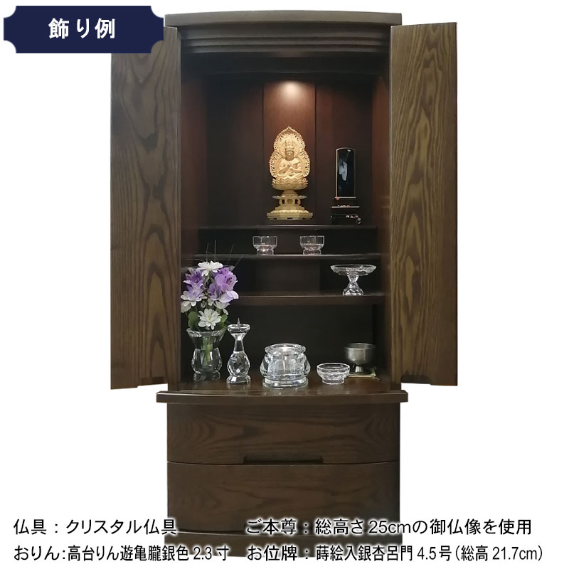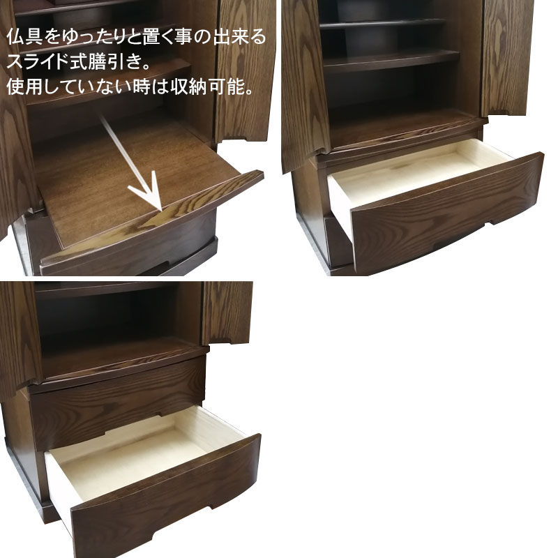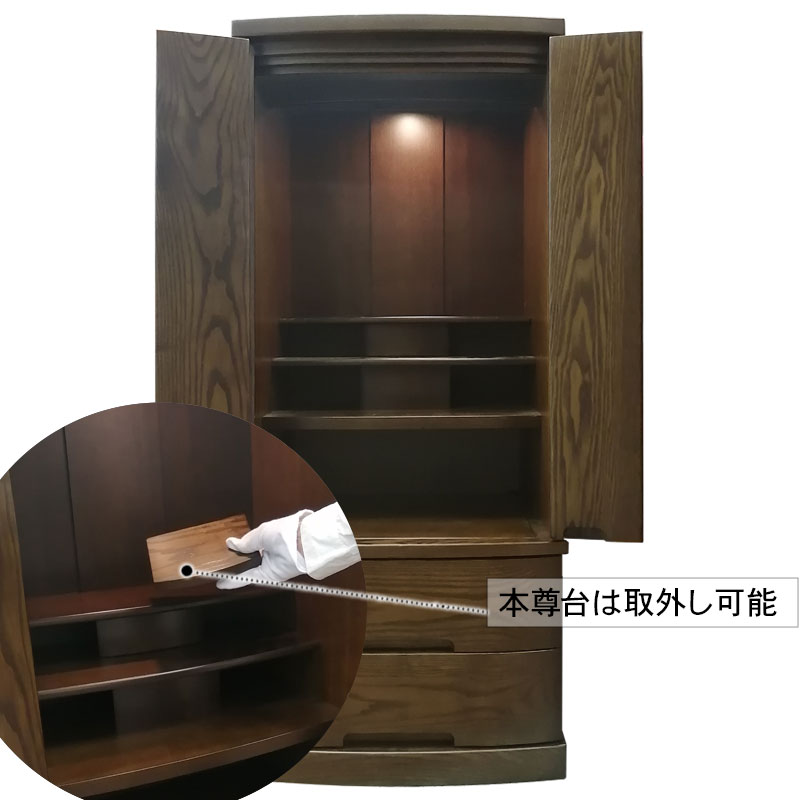| 商品説明 | 【商品番号:3106】 ◎日本堂オリジナル商品 ■材質詳細 ・笠、台輪/主材料:タモ厚板貼り 芯材料:パーチクルボード+木質繊維版 ・戸板、扉/主材料:タモ 芯材料:タモ ・その他/表面仕上げ:ウレタン仕上、生産地:日本 ■宗派 どの宗派でもお使いいただけます。 ■備考 ・商品は手作りの為、一部の色、デザイン、寸法が多少変更になる場合がございます。 ダークブラウンの落ち着いた色目にタモの力強い木目が美しいお仏壇で、和室にも洋室にも合うデザインとなっております。 高さが115cmで台座部分が低いので正座でのお参りにちょうど良い高さです。 幅を広くとった設計で大きめの仏具もゆったりと置く事ができます。 下台には、十分な深さの引出が2つ付いており、お線香やろうそくなどの収納に便利です。 須弥壇は脱着が可能で、御本尊様の大きに合わせて調整ができます。 |