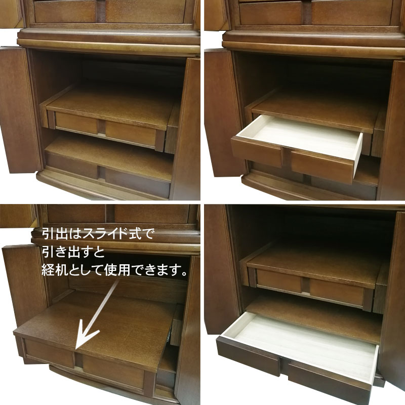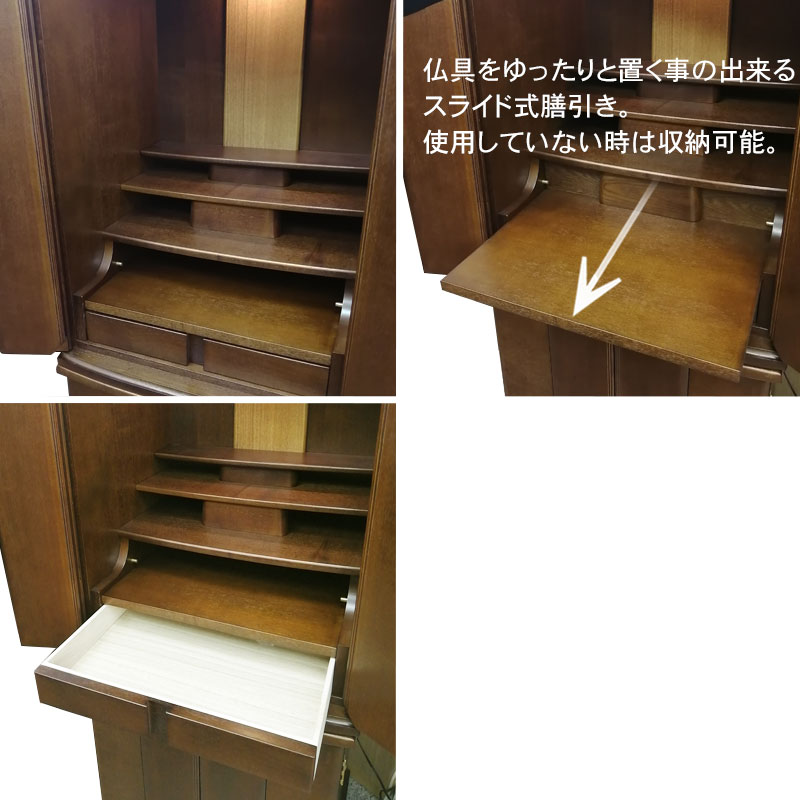 | 商品説明 | 【商品番号:3112】 ◎日本堂オリジナル商品 ■材質詳細 ・笠、台輪/主材料:タモ厚板貼り 芯材料:MDF+天然杢 ・戸板、扉/主材料:タモ厚板貼り 芯材料:MDF+天然杢 ・その他/表面仕上げ:ウレタンオープン仕上、生産地:日本 ■宗派 どの宗派でもお使いいただけます。 ■備考 ・商品は手作りの為、一部の色、デザイン、寸法が多少変更になる場合がございます。 濃い目のブラウンにスラっとまっすぐ伸びた木目が美しいモダンな家具調仏壇となっております。 須弥壇は取外し可能で、ご本尊様の大きさに合わせて調整できます。 また、下台の引出はスライド式で引き出すと経机としても使用可能です。 引出も、上台に1つ、下台に2つとたっぷり収納でき多機能なお仏壇となっております。 |