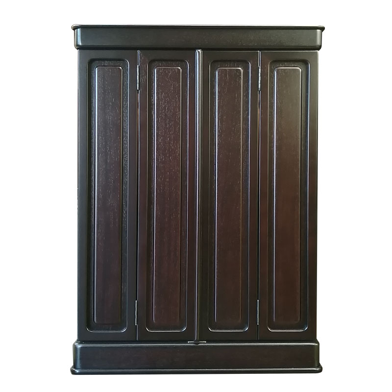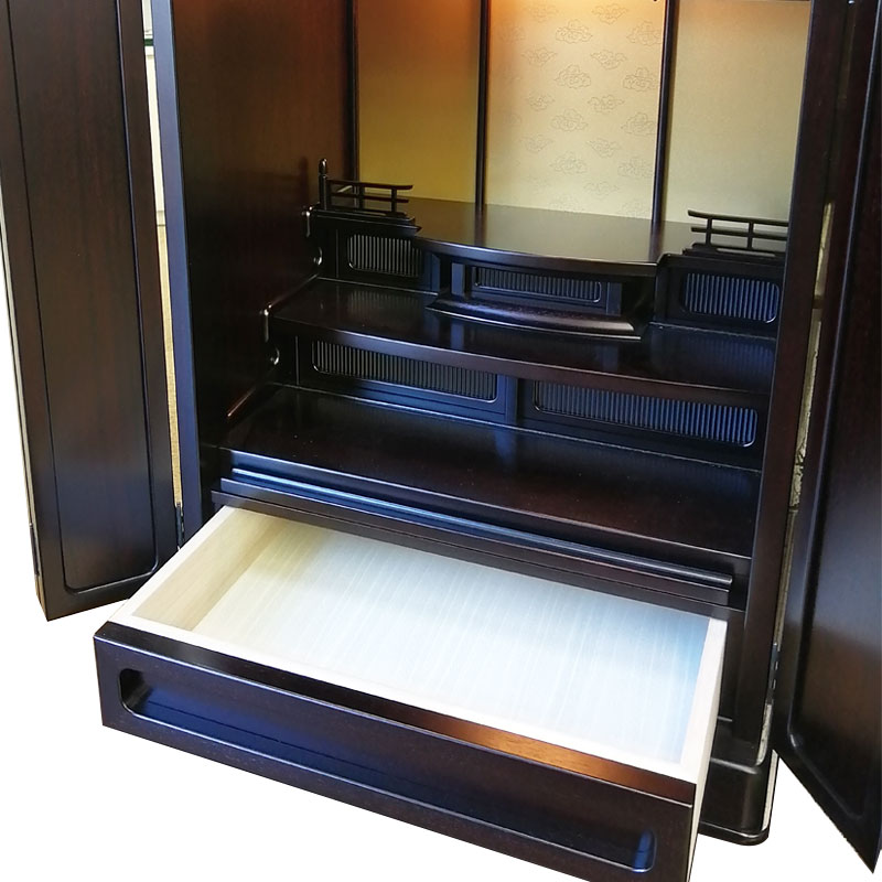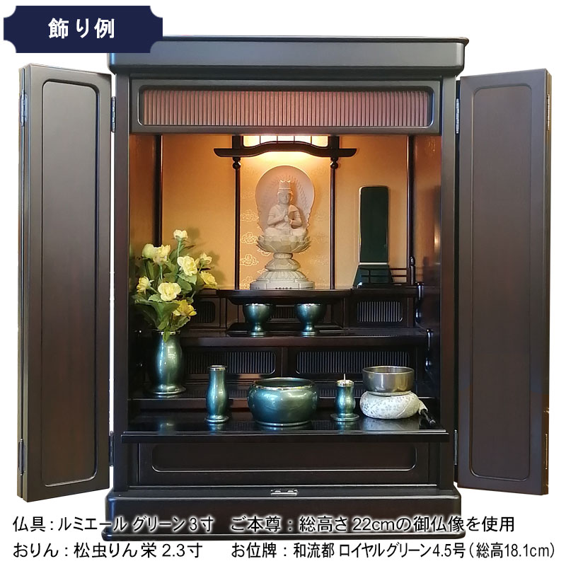 | 商品説明 | 【商品番号:3128】 ■材質詳細 ・笠、台輪/主材料:紫檀系(グラナディロ)厚板貼り 芯材料:天然木材 ・戸板、扉/主材料:紫檀系(グラナディロ)無垢 芯材料:紫檀系(グラナディロ)無垢 ・大戸軸/主材料:紫檀系(グラナディロ)二方厚板貼 芯材料:天然木材 ・その他/表面仕上げ:ウレタン仕上 オープン、生産地:日本 ■宗派 どの宗派でもお使いいただけます。 ■備考 ・商品は手作りの為、一部の色、デザイン、寸法が多少変更になる場合がございます。 他以下のサイズがございます。 ●20号:高61×幅48×奥行39cm 会津製の国産仏壇「風林火山」。 紫檀色の落ち着いた色合いに、欄間や余間などに縦の格子模様を設けたスッキリとしたデザインのお仏壇です。 背板は柄の入った金紙張りで明るい仕上がりとなっております。 高欄は小さめのマグネット式で着脱が簡単です。 また、須弥壇がせり出しているので、台座の大きい仏像もお祀りいただけます。 照明はLEDナツメ球の2灯式で、お仏壇内部を明るく照らします。 |