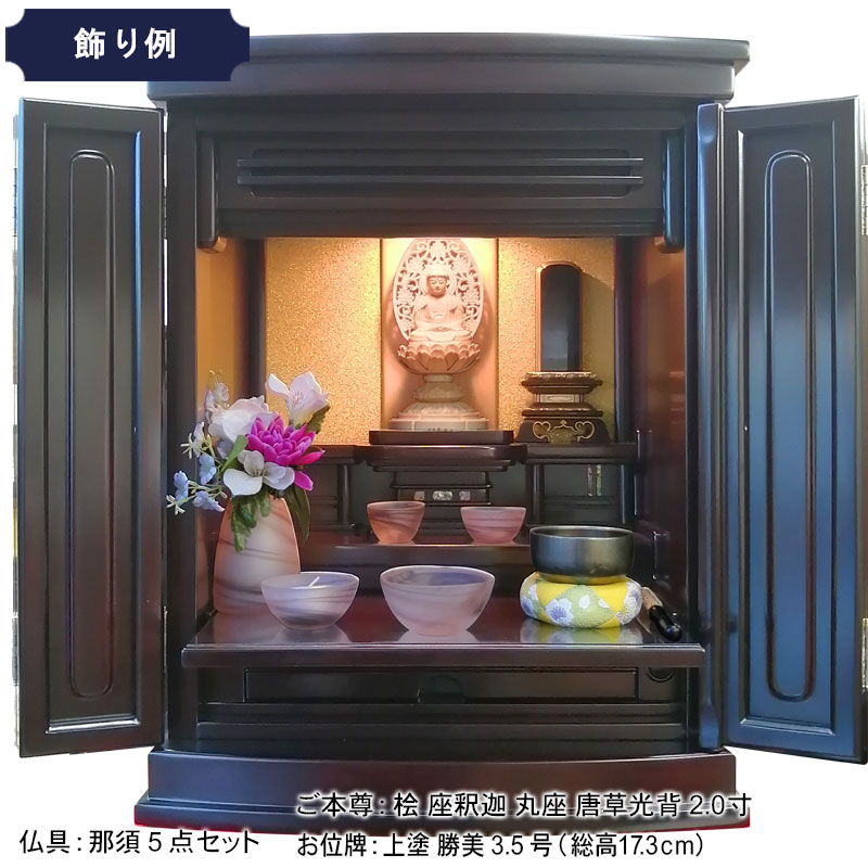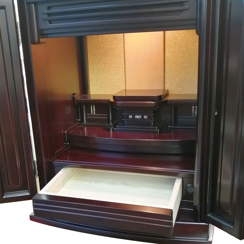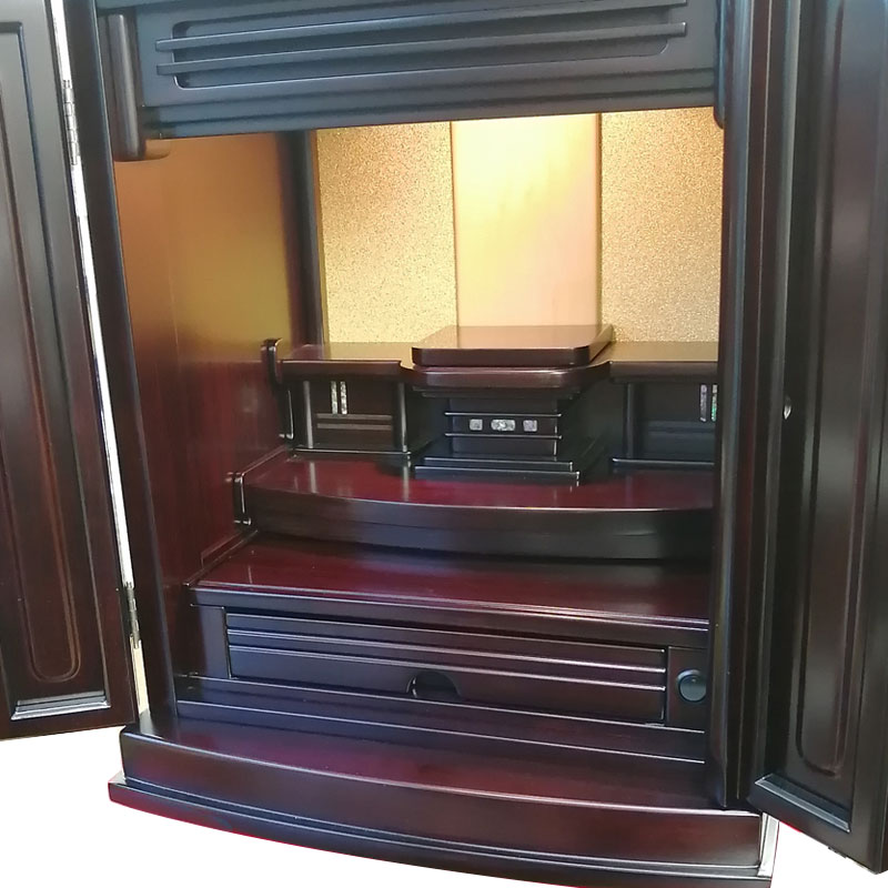 | 商品説明 | 【商品番号:3171】 ■材質詳細 ・笠、台輪/主材料:紫檀調プリント 芯材料:MDF ・戸板、扉/主材料:紫檀調プリント 芯材料:MDF ・大戸軸/主材料:紫檀調プリント 芯材料:MDF ・その他/表面仕上げ:ウレタン仕上、生産地:海外 ■宗派 どの宗派でもお使いいただけます。 ■備考 ・商品は手作りの為、一部の色、デザイン、寸法が多少変更になる場合がございます。 紫檀調を採用することで、落ち着いた色合いの中にもうっすらと見える木目が美しく 低価格ながらも高級感のあるお仏壇となっております。 また、シンプルで飽きのこないデザインが和室・洋室問わずお部屋に馴染みます。 本尊台は取外し可能となっており、ご本尊様の大きさに合わせてご使用ください。 |