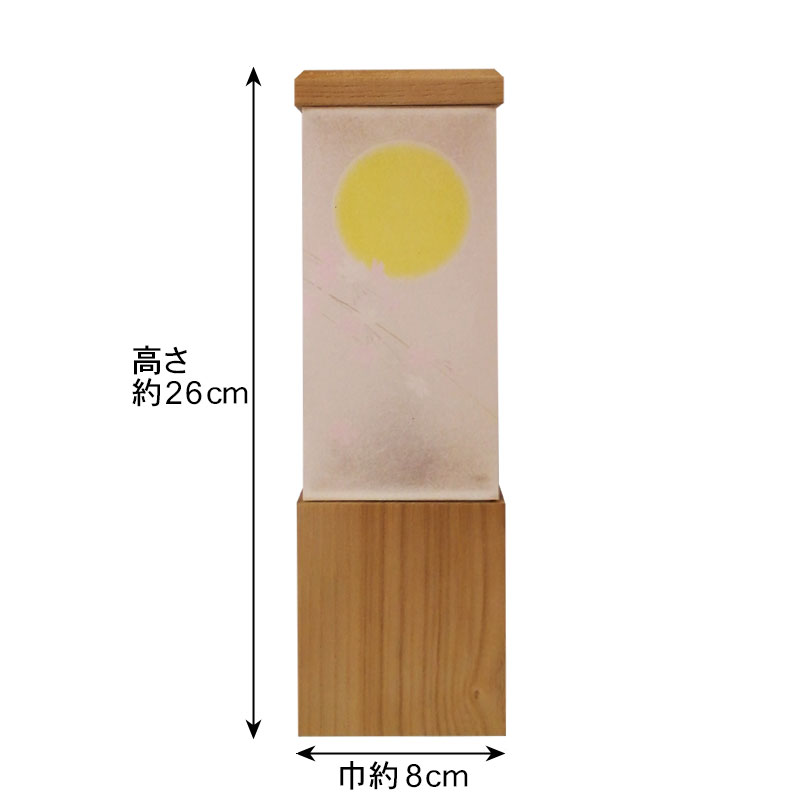| 商品説明 | 【商品番号:3206_35801】 ■商品詳細 ●寸法:高さ約26cm×巾約8cm ●材質: ベース&蓋:栓無垢材 ●仕様:コード式 ●器具: 金E12 オーロラ灯3灯タイプ×1 夏目球10W×1 ■備考: ●実店舗で商品をご覧になる場合は、ご来店希望の店舗に在庫をご確認下さい。 店舗により在庫が異なります。 ●HP掲載商品以外にも多数取り揃えております+。 ●数量限定のため売り切れる場合がございます。ご了承ください。 満月に桜柄をあしらった現代風の行灯で、控えめなサイズながらも、本格的な造りとなっております。 暖かみのある色合いの夏目球に加え、七色に色が変化するオーロラ灯が付属します。 セード部分は、マグネット式で取り外せるので、簡単に電球を変えることができます。 お盆以外にもインテリア照明としてもお使い頂けます。 <盆提灯> お盆提灯は一般に絵柄の付いた盆提灯が用いられ、お盆の期間中精霊棚の左右に飾ります。 お盆提灯飾りは一対飾りが基本ですが、盆棚の配置によって1張(個)飾りの場合もあります。 亡くなってからはじめて迎えるお盆は「新盆」といって盛大に供養を行い、ご葬家様は家紋入り提灯ならびに絵柄入り提灯・霊前灯・蓮華灯・等をご購入いただき、故人様の親兄弟・友人・知人は「新盆御見舞」として絵柄入り盆提灯をご葬家にお送りするのが一般的です。 また、新盆御見舞をお送りする場合は、ご葬家様のお盆月(7月もしくは8月)の一日に届くようにお送りする習わしがあります。 また、お盆の行事は故人の新盆から三十三回忌まで毎年行います。 |