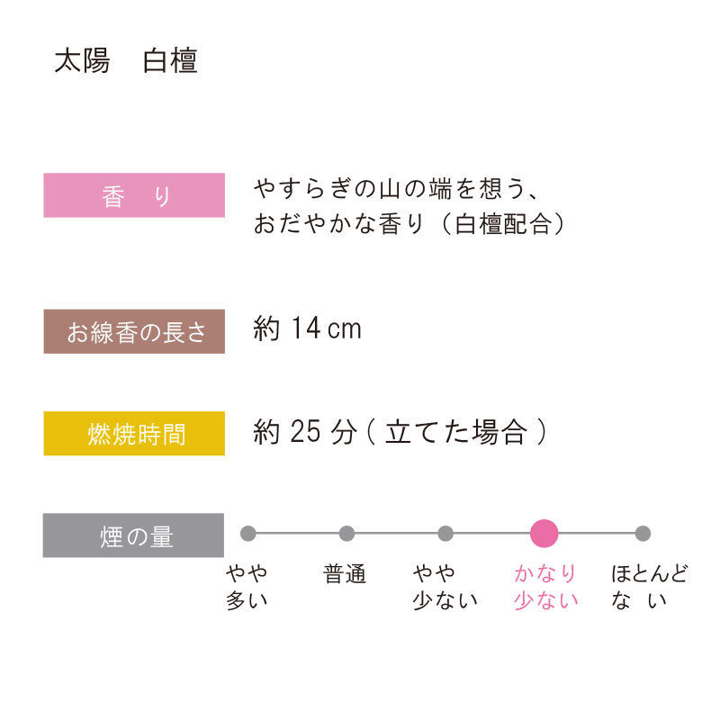 | 商品説明 | 【商品コード:3225】 ■商品詳細 ●やすらぎの山の端を想う、おだやかな香り(白檀配合) ●内容量:約100g ●お線香の長さ:約14cm ●煙量:かなり少ない ●燃焼時間:約25分(立てた場合) ●パッケージサイズ:長さ16.4×幅10×高さ3cm ●主原料:タブ粉、炭、香料 ※燃焼時間は、場所・気候(室内状態)により変化致します。 あまねくゆきわたる太陽の恵みを、あらためて感じたとき 「今こうしてあること」の有難みが実感されて それがご先祖様に対する感謝につながっていくー。 そんな自然な心の流れを託す「太陽」は、 気持ちをおだやかに受けとめるような、 落ち着いた香りが特徴の、クラシックモダンなお線香です。 <特徴> やすらぎの山の端を想う、おだやかな香り(白檀配合)です。 |