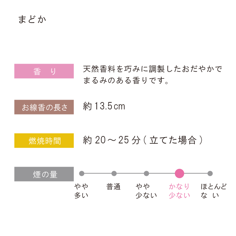 | 商品説明 | 【商品コード:3233】 ■商品詳細 ●お線香の長さ:約13.5cm ●煙量:かなり少ない ●燃焼時間:約20~25分(立てた場合) ●パッケージサイズ:長さ16×幅10×高さ3cm ※燃焼時間は、場所・気候(室内状態)により変化致します。 天然香料を巧みに調製したおだやかで まるみのある香りです。 煙も香りもほのかなタイプです。 |