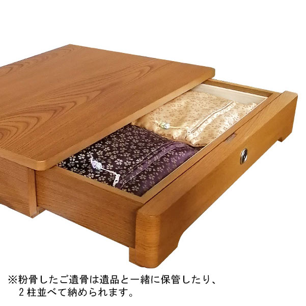 | 商品説明 | 【商品番号:3270】 ◎日本堂オリジナル商品 ご遺骨をパウダー状に粉骨し ご自宅で、故人を偲ぶことのできる新しいご供養のかたちです。 「日本堂オリジナル お参り壇」は、粉骨したご遺骨を家具のような自然な造りのお参り壇に収め、亡くなった家族を身近に感じながら、ご自宅でご供養できます。天板にはお仏壇をのせて仏教方式でお祀りしてもいいですし、供養台として故人の写真や思い出で飾るなど、伝統にこだわらない自由な形でご供養することができます。 鍵が付いているので、不用意に開けられることもありません。 開けてもすぐに中が見えないように、取外し可能な内蓋がついています。 粉骨したご遺骨は遺品と一緒に保管したり、また2柱並べて納める事もできます。 ■商品詳細 ●カラー:ケヤキ調 ●サイズ:高さ10×幅53×奥行39cm ※粉骨、洗骨には別途料金が必要です。 |