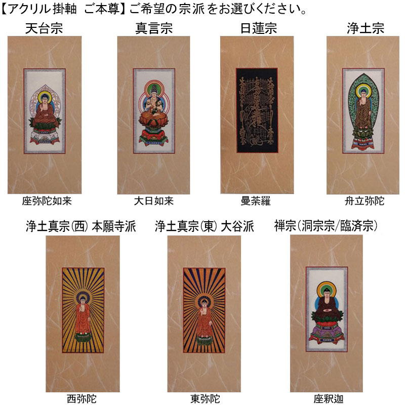 | 商品説明 | 【商品コード:3274】 ■商品詳細 ●サイズ: S寸: H20cm× W9cm × D3.5cm ●宗派:八宗対応(ご希望の宗派をお選び下さい) ●本紙:プリント制 家具調仏壇にもピッタリのすっきりしたデザインのご本尊様用スタンド掛軸です。 お仏壇に置くだけで簡単に設置出来ます。 前面が透明アクリル板になっているため、ろうそくやお線香のスス汚れや傷を防止します。 |