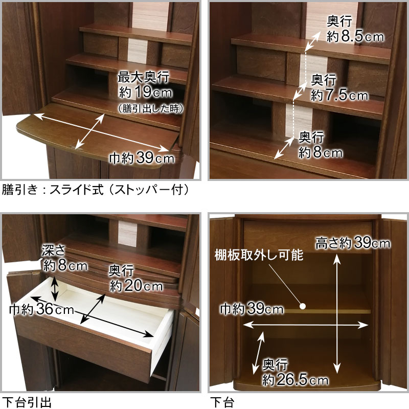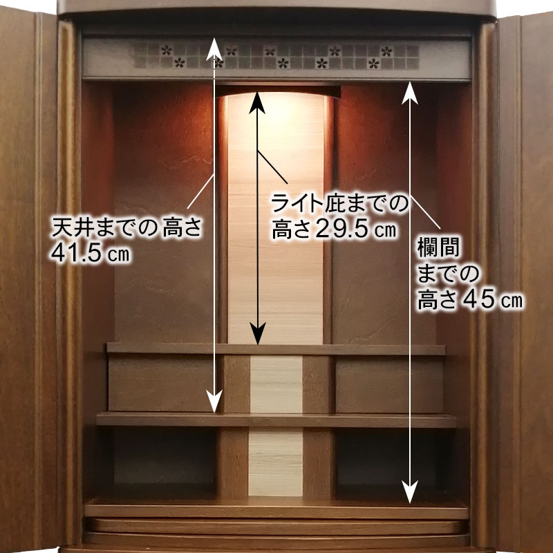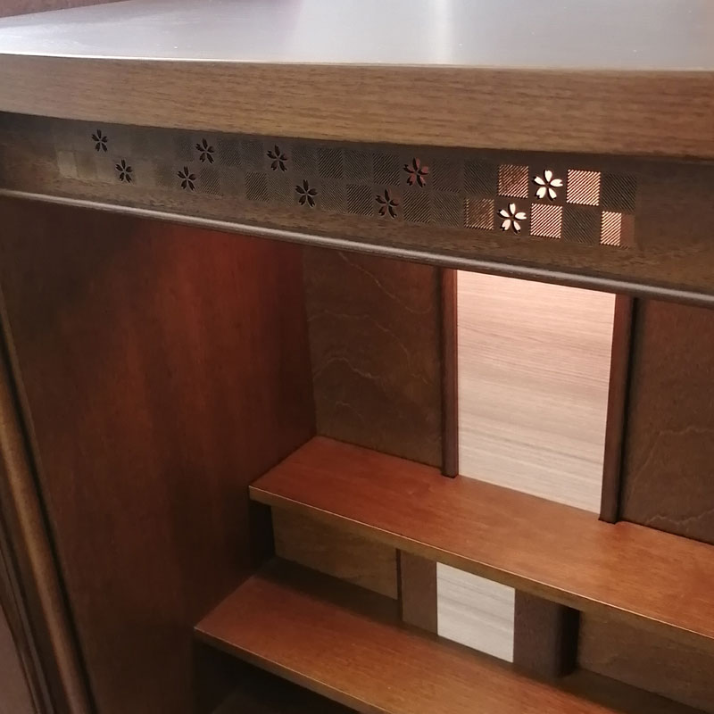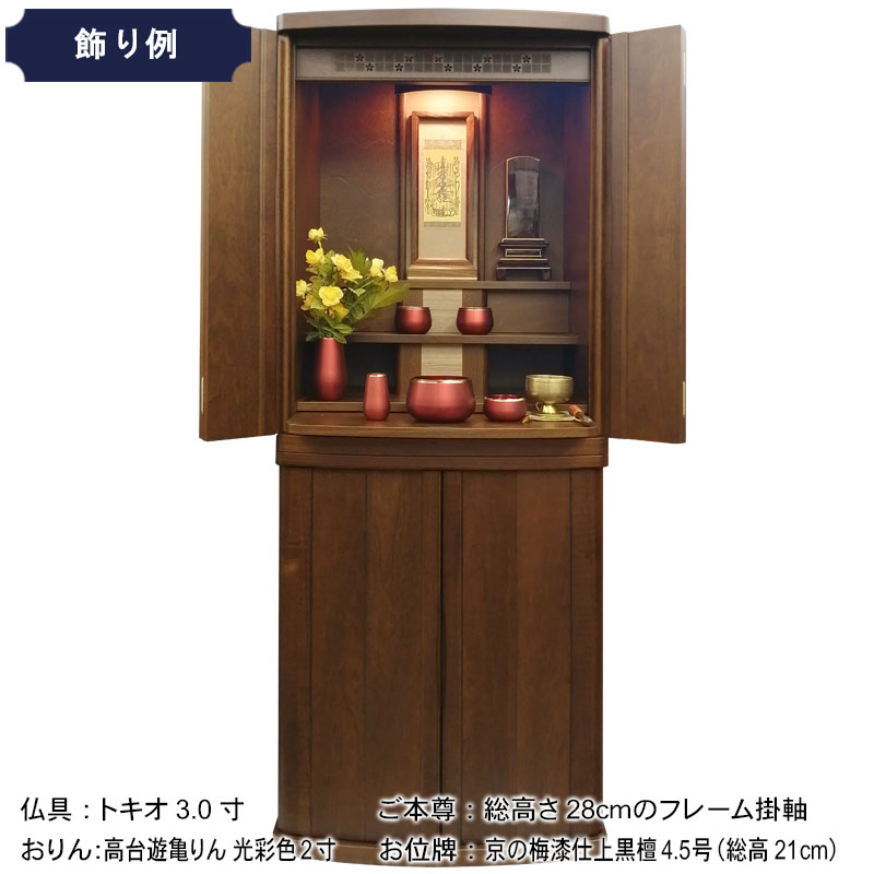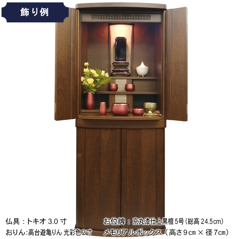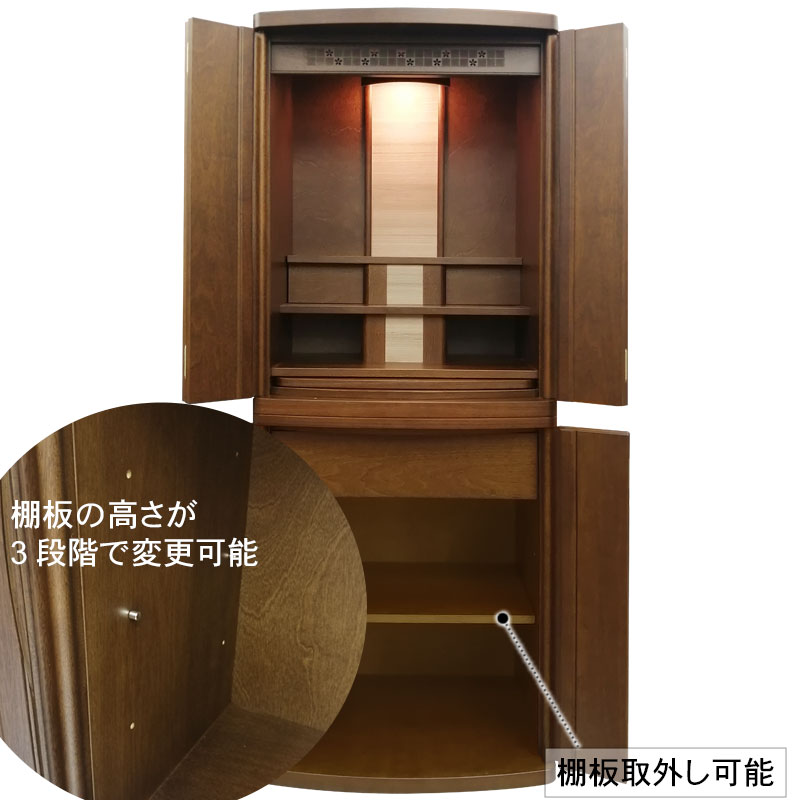 | 商品説明 | 【商品番号:3278】 ◎日本堂オリジナル商品 ■材質詳細 ・笠、台輪/主材料:ウォールナット無垢 芯材料:天然合板・MDF ・戸板、扉/主材料:ウォールナット無垢 芯材料:天然合板・MDF ・その他/表面仕上げ:ウレタン仕上、生産地:日本 ■宗派 どの宗派でもお使いいただけます。 ■備考 ・商品は手作りの為、一部の色、デザイン、寸法が多少変更になる場合がございます。 弊社の上置型仏壇の人気商品「SR」の台付型お仏壇「ドール」です。 世界三大銘木としても知られ、落ち着いた滑らかな木目が特徴のウォールナット材を使用しており、 ウォールナットの木目を活かしたブラウンで、洋室やリビング、和室にも自然に溶け込む家具調仏壇となっております。 内部の須弥壇は取り外しが可能で、ご本尊や掛軸の大きさに合わせて高さを変えることができます。 また、下台には深さがたっぷりある引出があり、お仏壇まわりの小物を収納できます。 棚板は、高さが3段階で調整でき、取り外すことも出来るので、骨壷が骨箱ごと収納可能となっております。 ライトには、光が直接目に入らないように目隠しがついています。また、欄間の花びらの彫からは、照明がうっすらともれるやさしいデザインになっています。 内部照明には、LEDライトを採用し暗いお部屋や夜間でも明るく照らします。 |