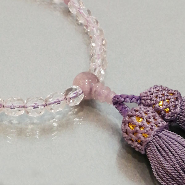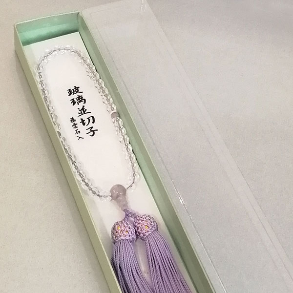 | 商品説明 | 【商品コード:3282】 ■珠の素材 ●主珠:玻璃並切子(約7mm)※玻璃(ハリ)はガラスのことです。 ●親珠:藤雲石(約10mm) ●天珠:藤雲石(約5mm) ■特徴 主珠には切子カットを施した玻璃珠(ガラス珠)を使用しており、そのカット方法から光を当てると美しく輝きます。 親珠、天珠には藤雲石を使用しています。 藤雲石は、紫色の薄いアメジスト(紫水晶)の中で白色の雲のような模様があり、柔らかな藤色が魅力のひとつです。 藤雲石のやさしく落ち着いた色合いは、年齢を問わずご使用いただける仕上がりとなっております。 数珠は、寿珠とも言われ縁起のいいプレゼントとして、成人式や就職祝いなどに贈られることが多いようです。 進物用の商品につきましては、包装をしてお届けいたします。 「志」「御祝」などの、のし紙も無料でお付けすることができます。 包装やのし紙をご希望の方は、お客様情報入力ページの「ご連絡事項」欄にご記入ください。 ■宗派 どの宗派でもお使いいただける片手略式数珠です。 ■備考 ●数珠は紙箱入り |