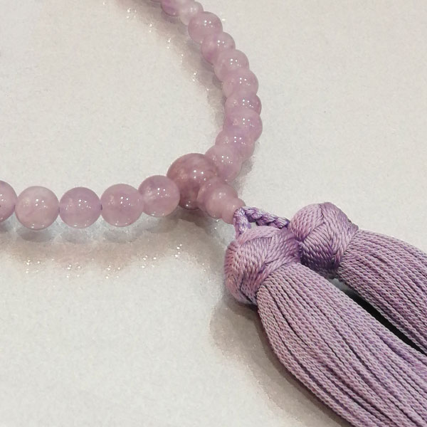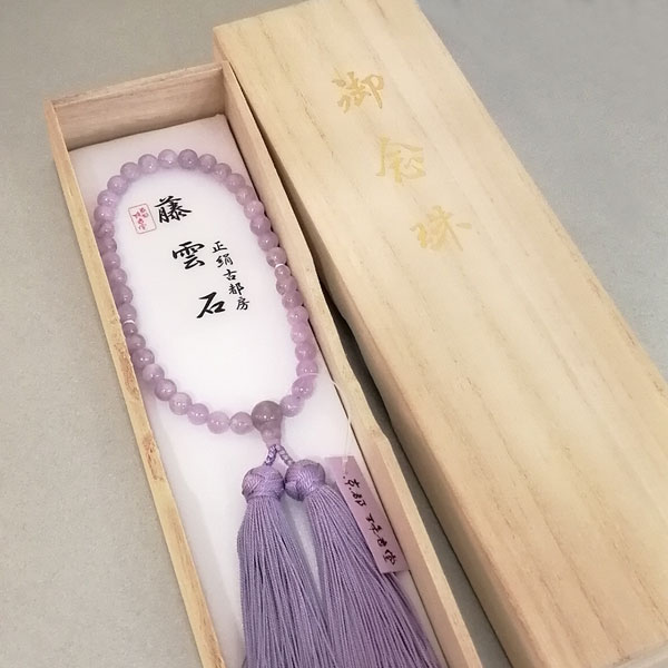 | 商品説明 | 【商品コード:3290】 ■珠の素材 ●主珠:藤雲石(約7mm) ●親珠:藤雲石(約10mm) ●天珠:藤雲石(約5mm) ■房の素材 ●正絹古都房(房、通し糸共正絹) ■特徴 主珠、親珠、天珠に藤雲石を使った女性用の数珠です。 藤雲石は、紫色の薄いアメジスト(紫水晶)の中で白色の雲のような模様があり、柔らかな藤色が魅力のひとつです。 藤雲石のやさしく落ち着いた色合いは、年齢を問わずご使用いただける仕上がりとなっております。 頭付松房には高級素材の正絹を使用しており京都の数珠職人が匠の技で仕立てた逸品でございます。 数珠は、寿珠とも言われ縁起のいいプレゼントとして、成人式や就職祝いなどに贈られることが多いようです。 進物用の商品につきましては、包装をしてお届けいたします。 「志」「御祝」などの、のし紙も無料でお付けすることができます。 包装やのし紙をご希望の方は、お客様情報入力ページの「ご連絡事項」欄にご記入ください。 ■宗派 どの宗派でもお使いいただける片手略式数珠です。 ■備考 ●数珠は桐箱入り(桐箱は防腐成分や虫よけの成分を含み、湿気予防にも最適です。保管の際は、防虫剤を一緒に入れると虫食い予防になります。) ●天然素材のため商品には若干の差があります。 |
